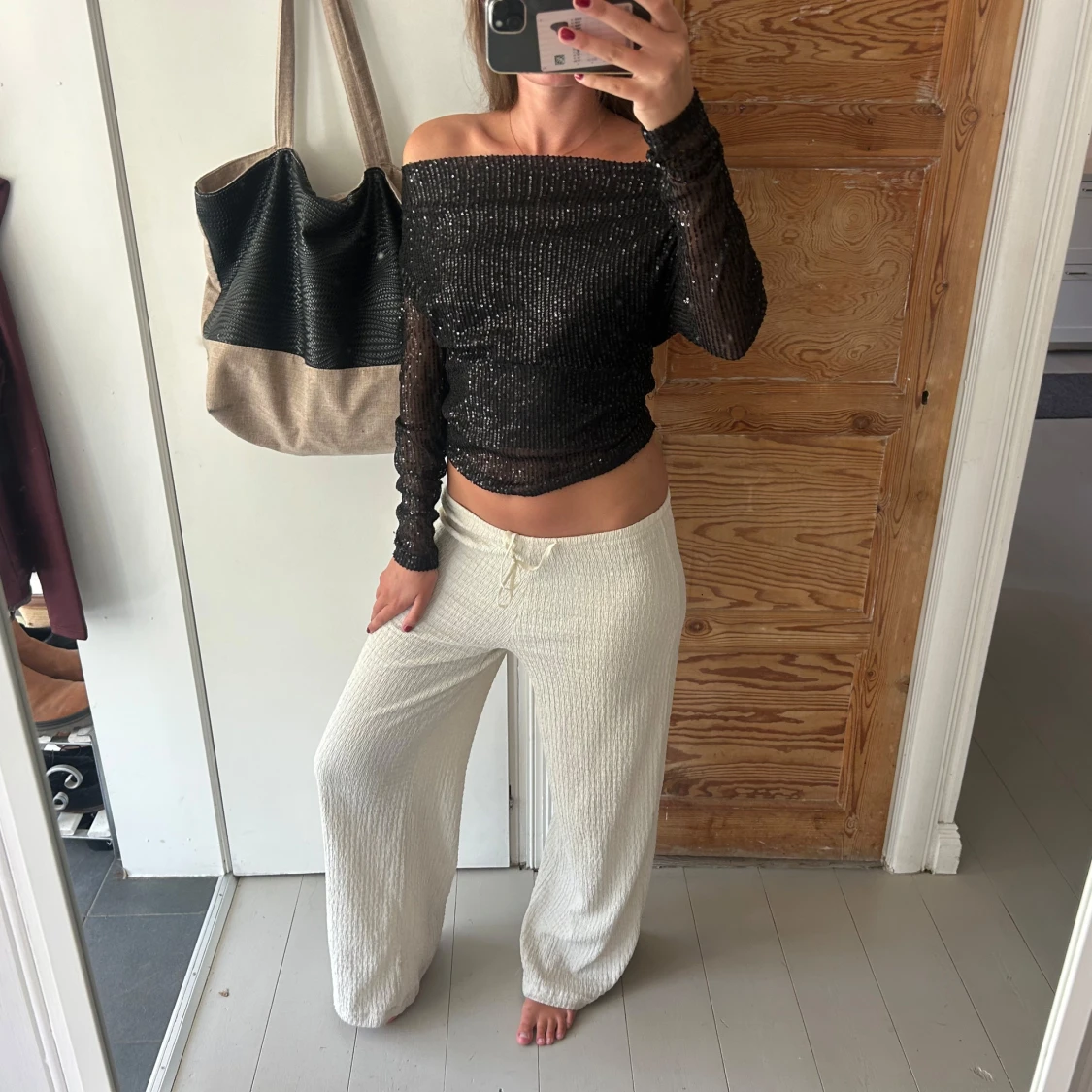 Snygg svart topp med glittriga paljetter och transparent mesh. Offshoulder-modell med långa ärmar och croppad passform som visar midjan. Perfekt för dig som vill sticka ut med lite extra bling och cool vibe.