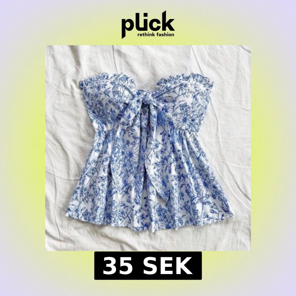 Supersöt bandeau topp med blått blommigt mönster på vit botten. Toppen har volangkant upptill, knytning framtill och smockad rygg för extra komfort. Luftig och flowy passform, perfekt för varma dagar. Materialet känns mjukt och lätt mot huden, endast testad💞