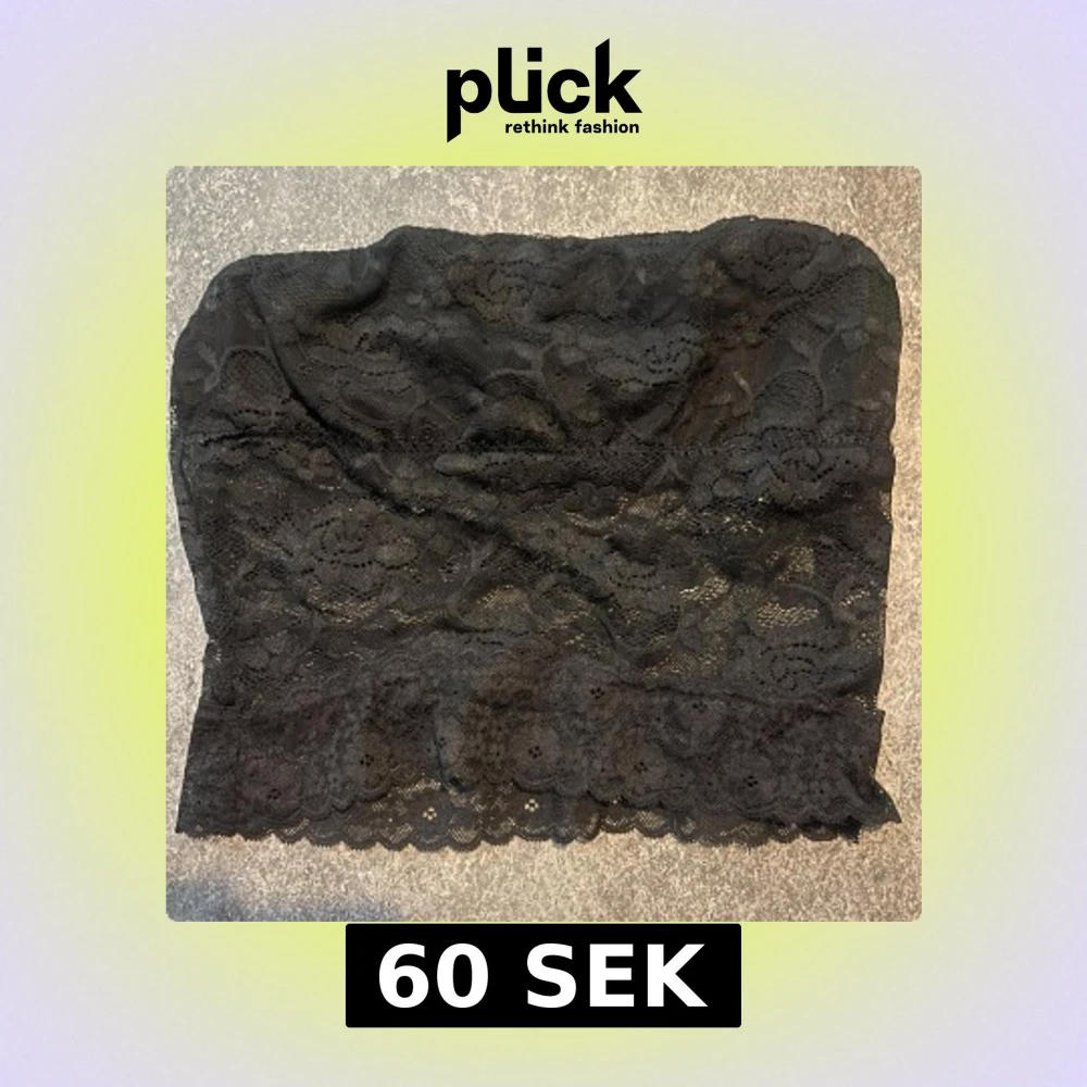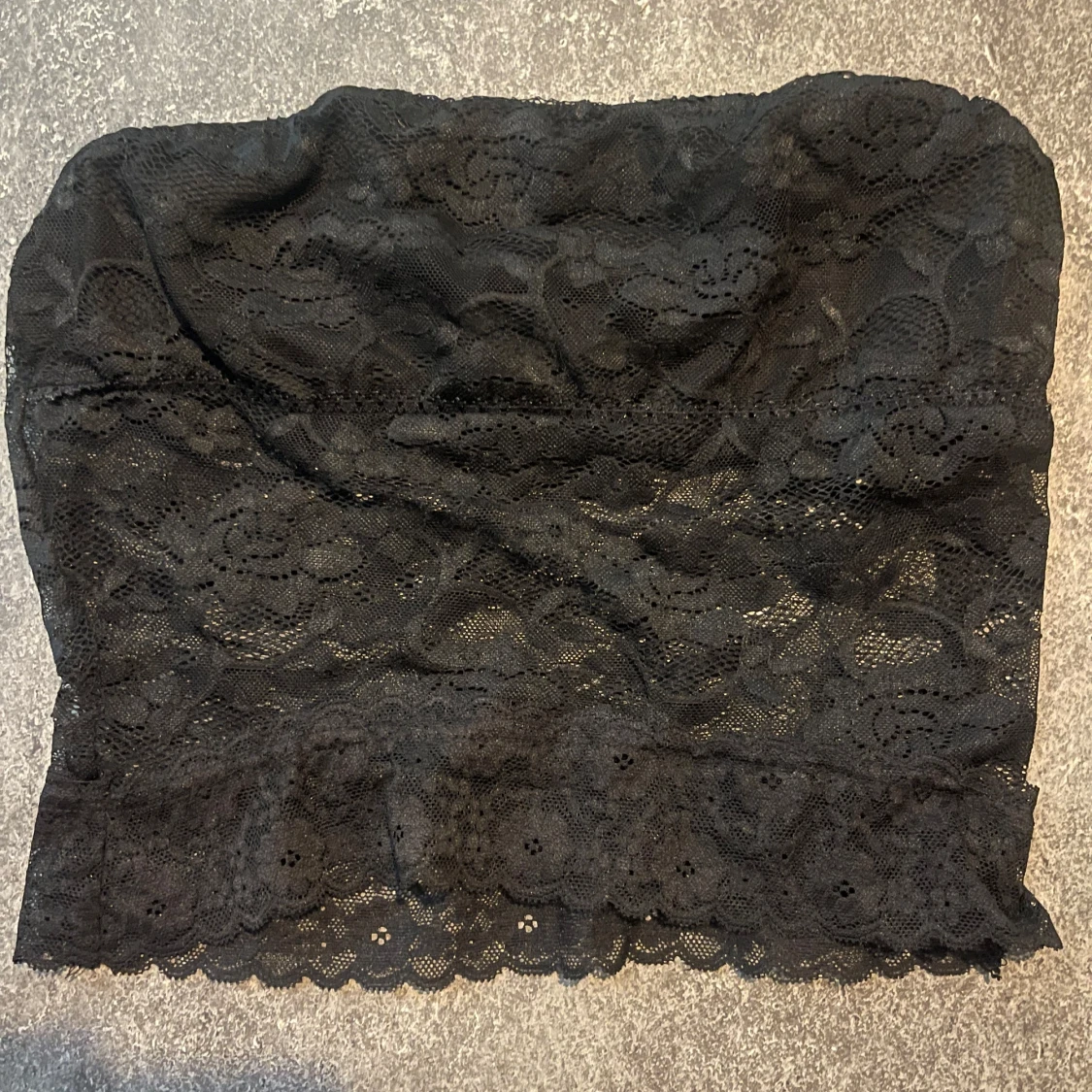 Säljer en svart bandeau tubtopp i spets med blommigt mönster och vågig kant nertill. Toppen är ärmlös och har en snygg, feminin look som passar perfekt till lager-på-lager eller som statement-piece. Superstretchig och bekväm att bära.