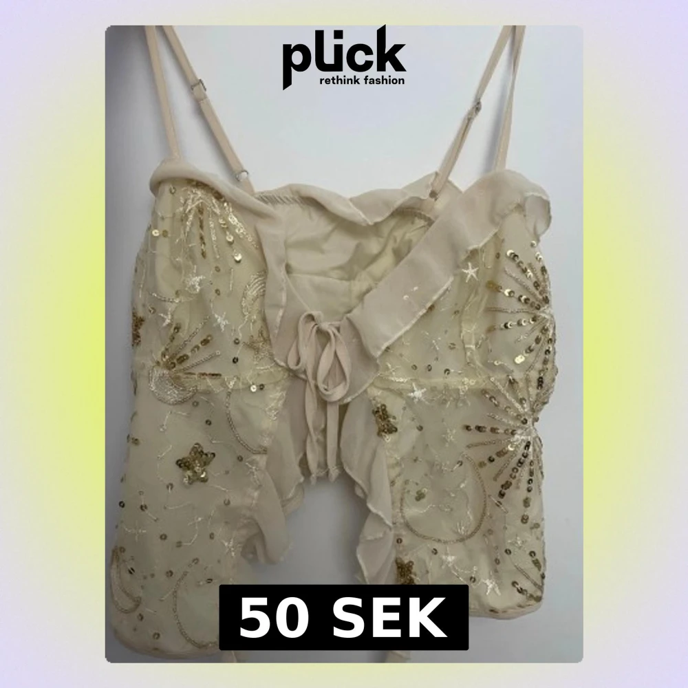 Supersöt beige bolerotopp med tunna axelband, snörning framtill och massor av guldiga paljetter och broderier i stjärn- och månform. Tunn mesh och volangkant ger en drömmig känsla, perfekt för att sticka ut.