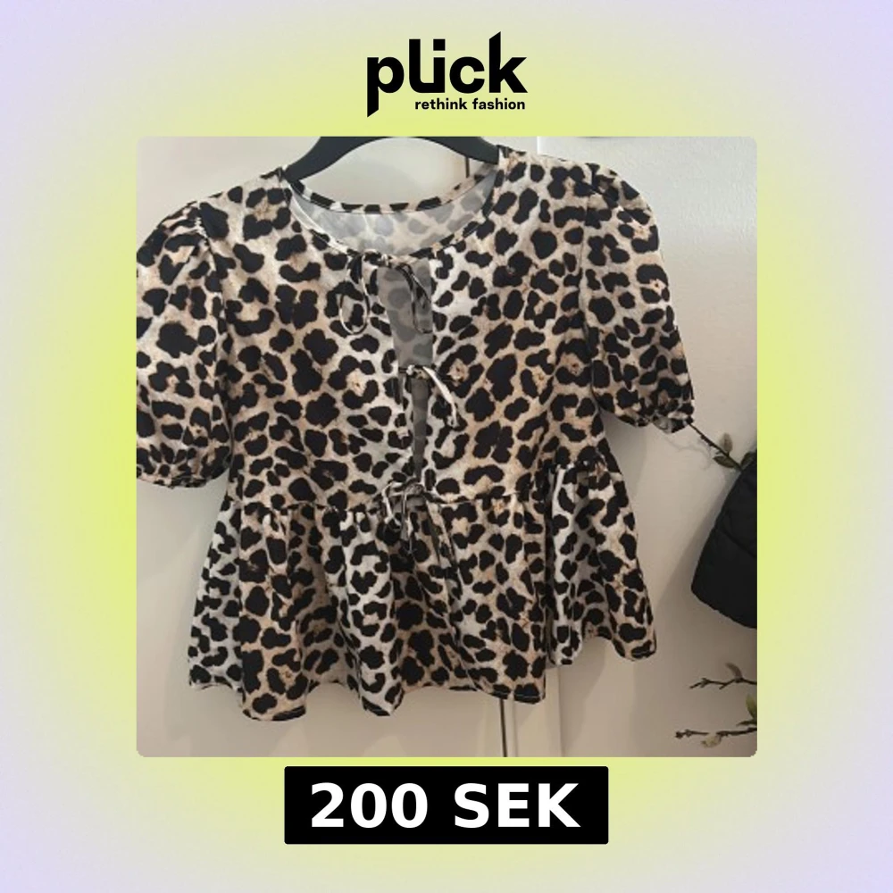 Säljer en trendig blus med leopardmönster och puffiga korta ärmar. Blusen har tre dekorativa knyt framtill och en lätt utställd passform nedtill. Perfekt för dig som vill sticka ut med ett djurmönster! Oanvänd