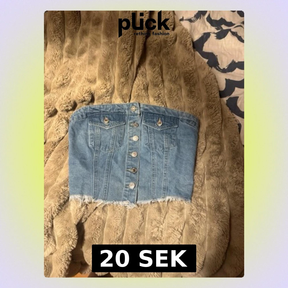 Säljer en blå croppad bustier i jeans med knappar framtill och rå, fransig kant nedtill. Toppen har dekorativa bröstfickor och smockad rygg för skön passform. Perfekt för dig som vill ha en edgy och trendig look.