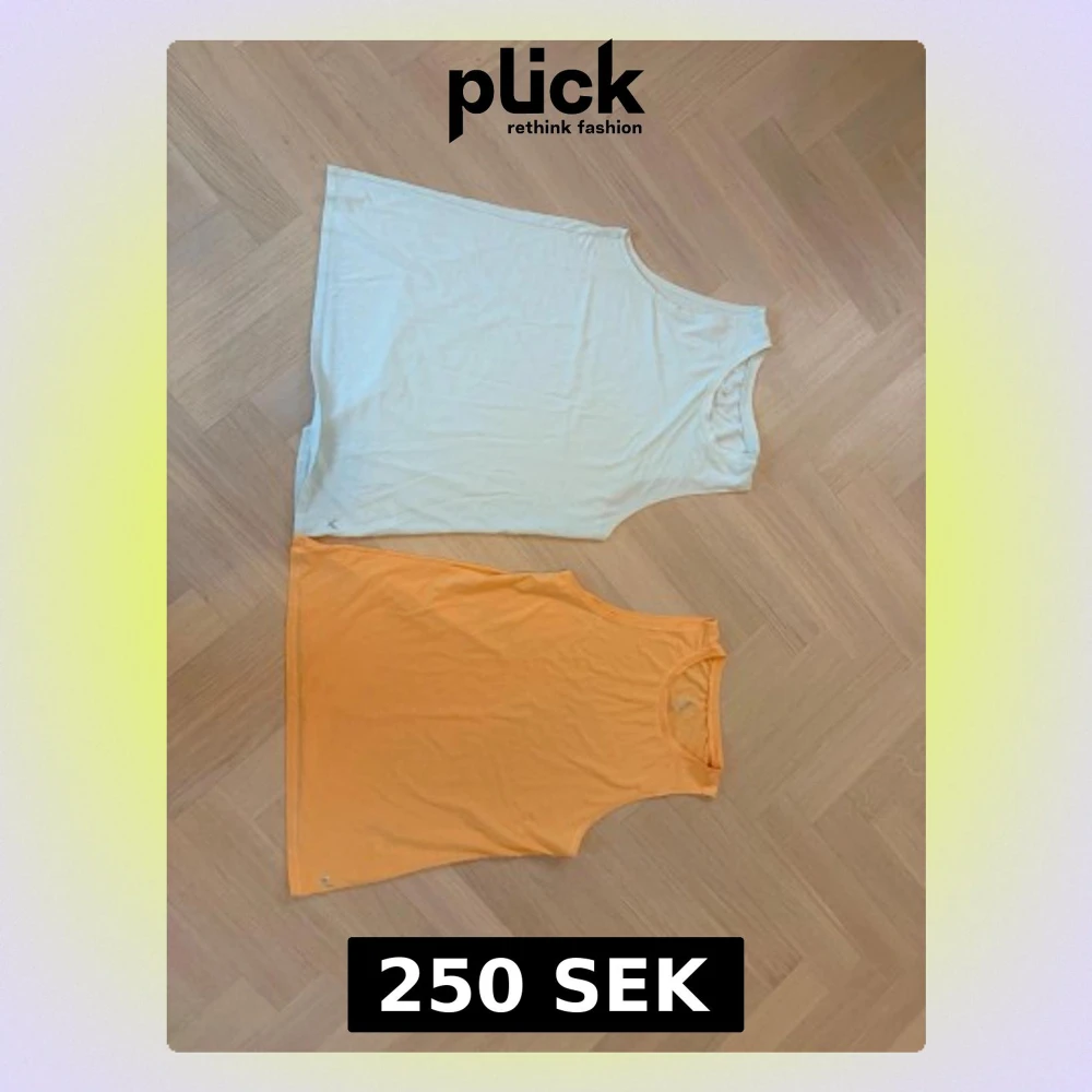 Säljer två snygga linnetoppar i polyester och viskos, en i ljusblå och en i orange. Båda har ett diskret blomtryck framtill och är ärmlösa med rund hals. Perfekta för yoga eller träning. De har ett medel stort tryck på ryggen. De är båda från stadium.