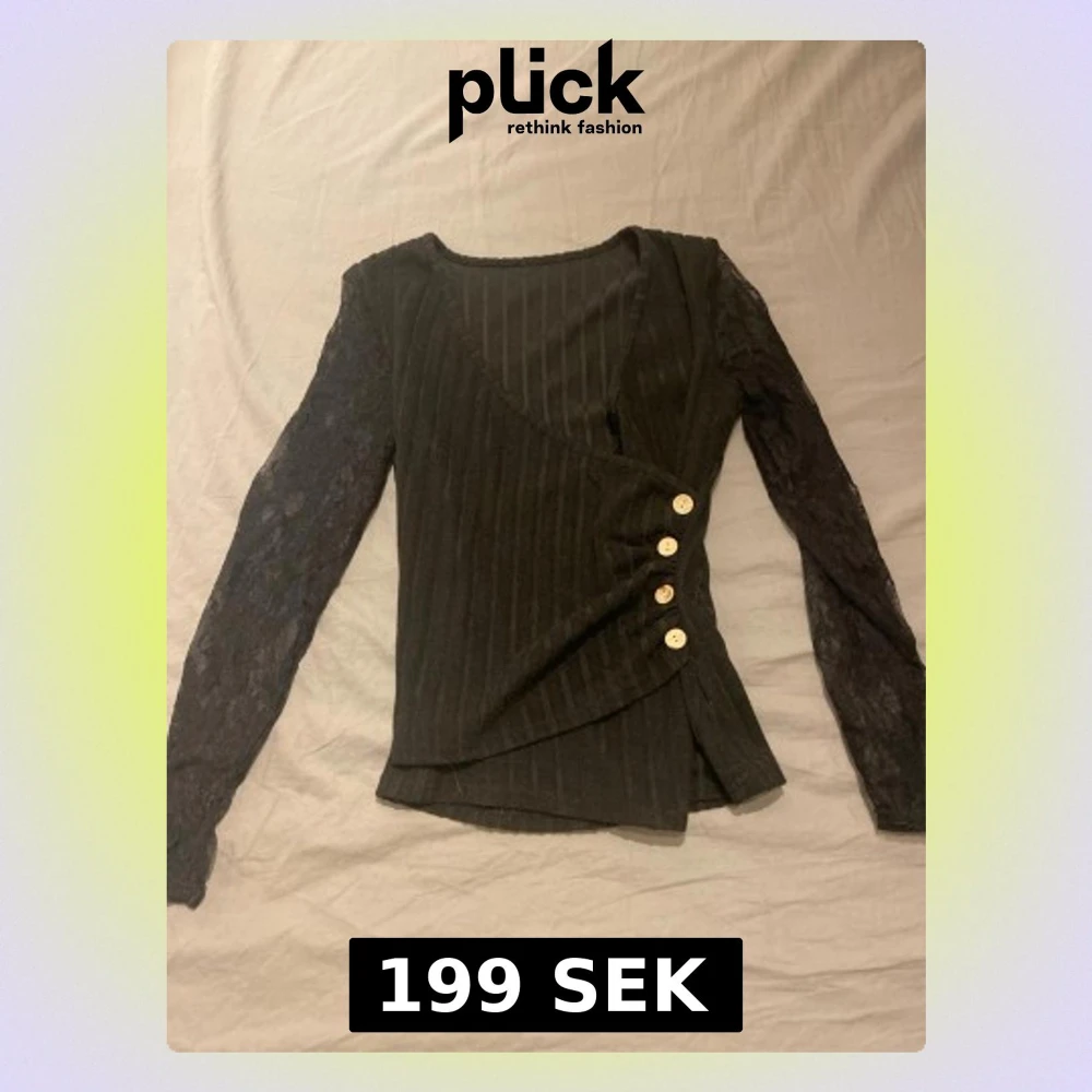 Snygg svart omlottopp med ribbat tyg och transparenta spetsärmar. Toppen har fyra dekorativa knappar på sidan och en v-ringad halsringning. Perfekt för dig som vill ha en unik och trendig look. Använd ca 2ggr