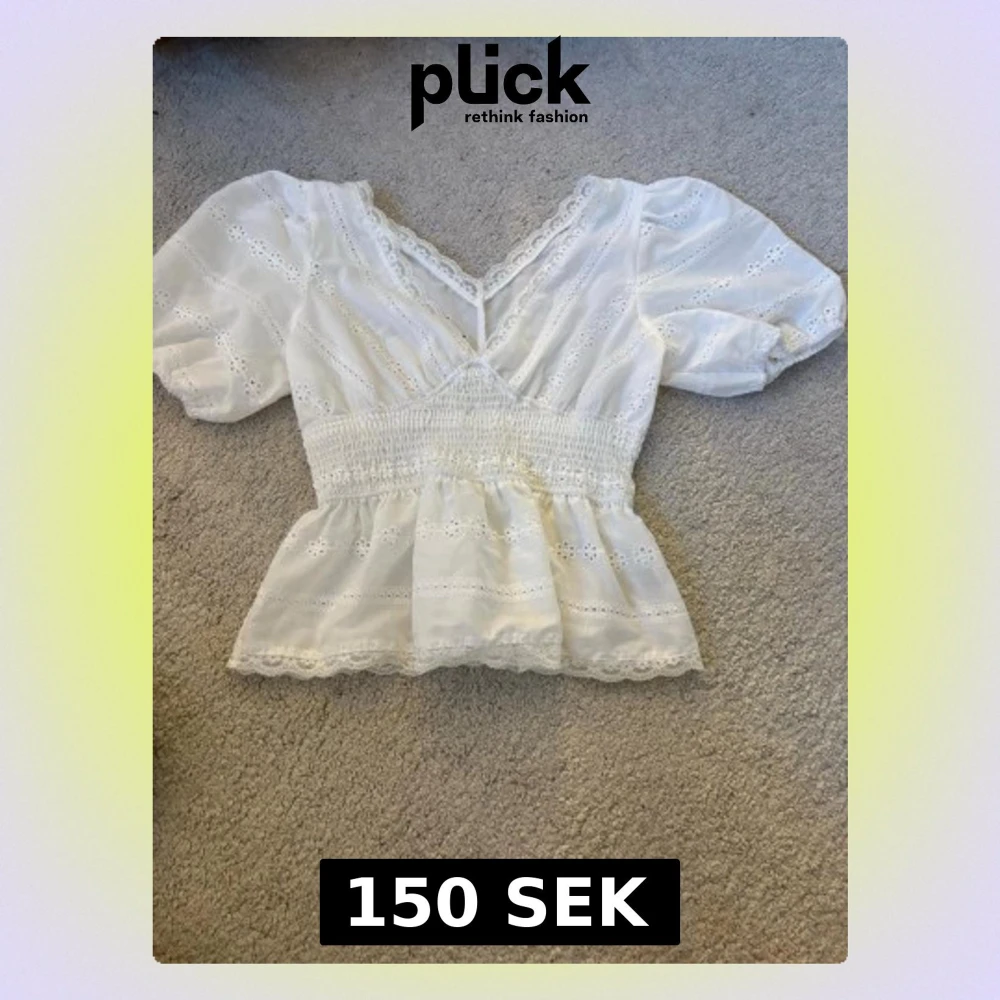 Söt vit blus med v-ringning, puffärmar och smock i midjan. Blusen har fina spetsdetaljer och broderade blommor, samt volangkant nedtill. Passar väldigt fint med ett par kostymbyxor eller ett par jeans. Aldrig använd och vet tyvärr inte vart den är ifrån.