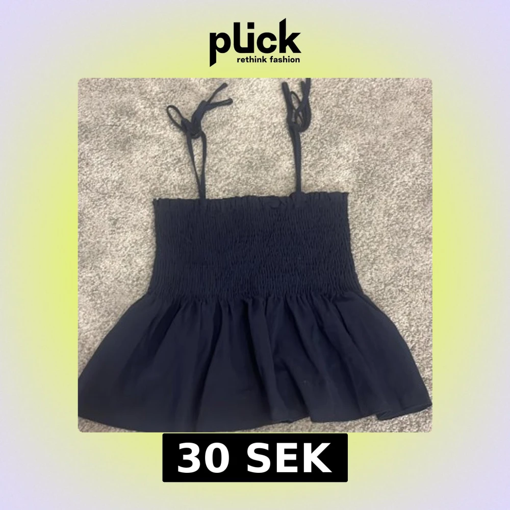 Supersöt mörkblå linnetopp med smockad överdel och volang nertill. Axelbanden knyts på axlarna för en personlig touch. Perfekt till jeans eller kjol när du vill ha en chill men ändå snygg look.