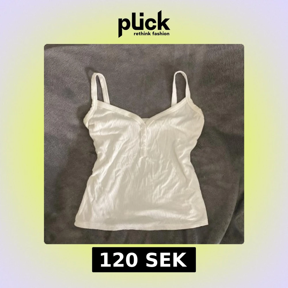 Säljer en vit ribbad linnetopp med smala axelband och v-ringning framtill. Toppen har tre små knappar vid urringningen och är figurnära i modellen. Perfekt för varma dagar eller att styla i lager på lager.