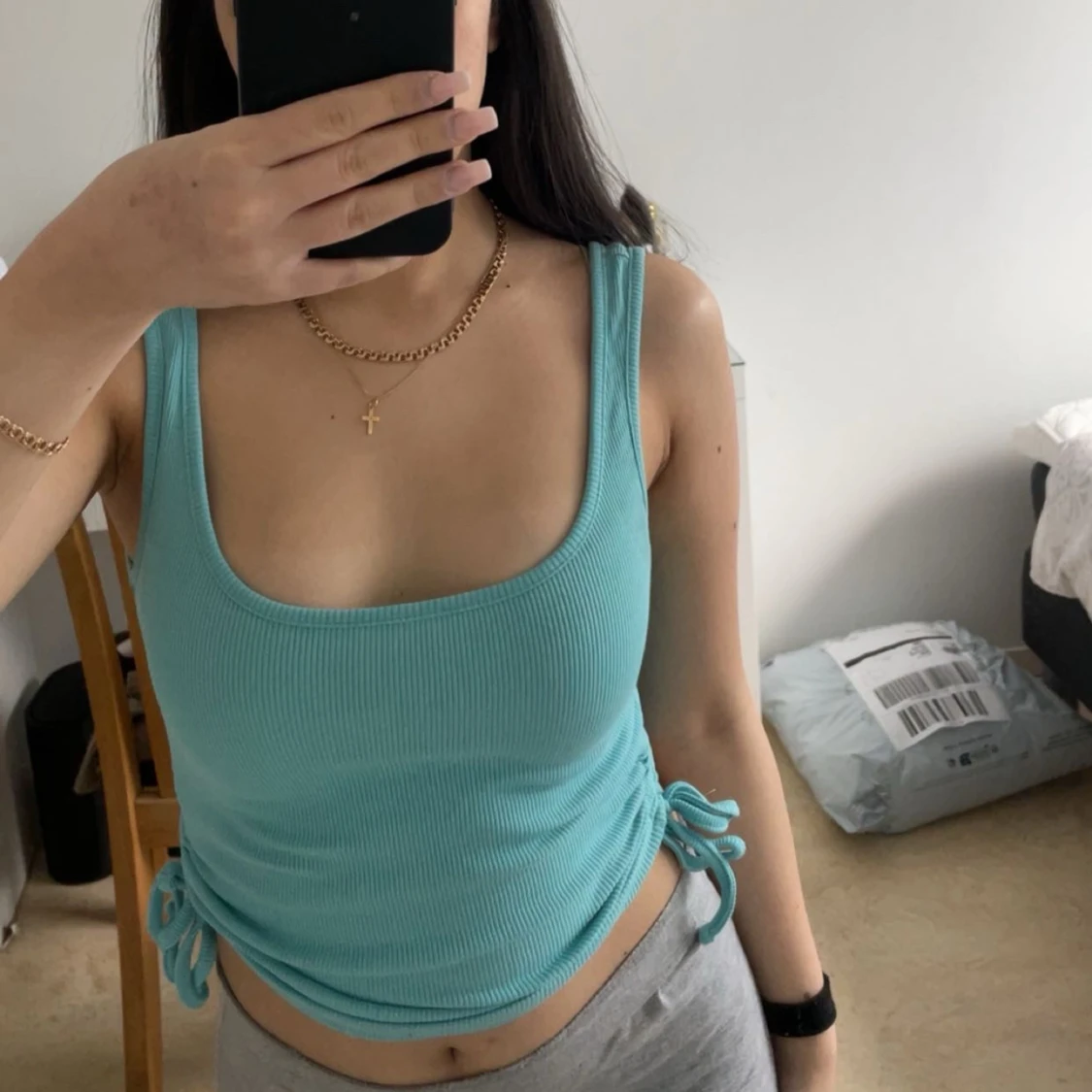 Säljer en snygg turkos ribbad linnetopp med knytning i sidorna. Toppen är ärmlös och croppad, perfekt för varma dagar. Passar bra till både jeans och kjol. Hör av dig vid intresse!