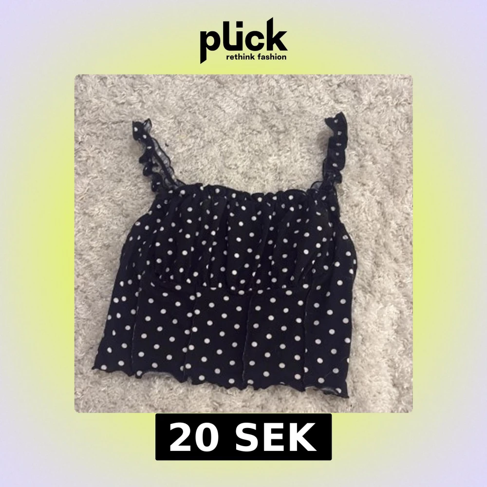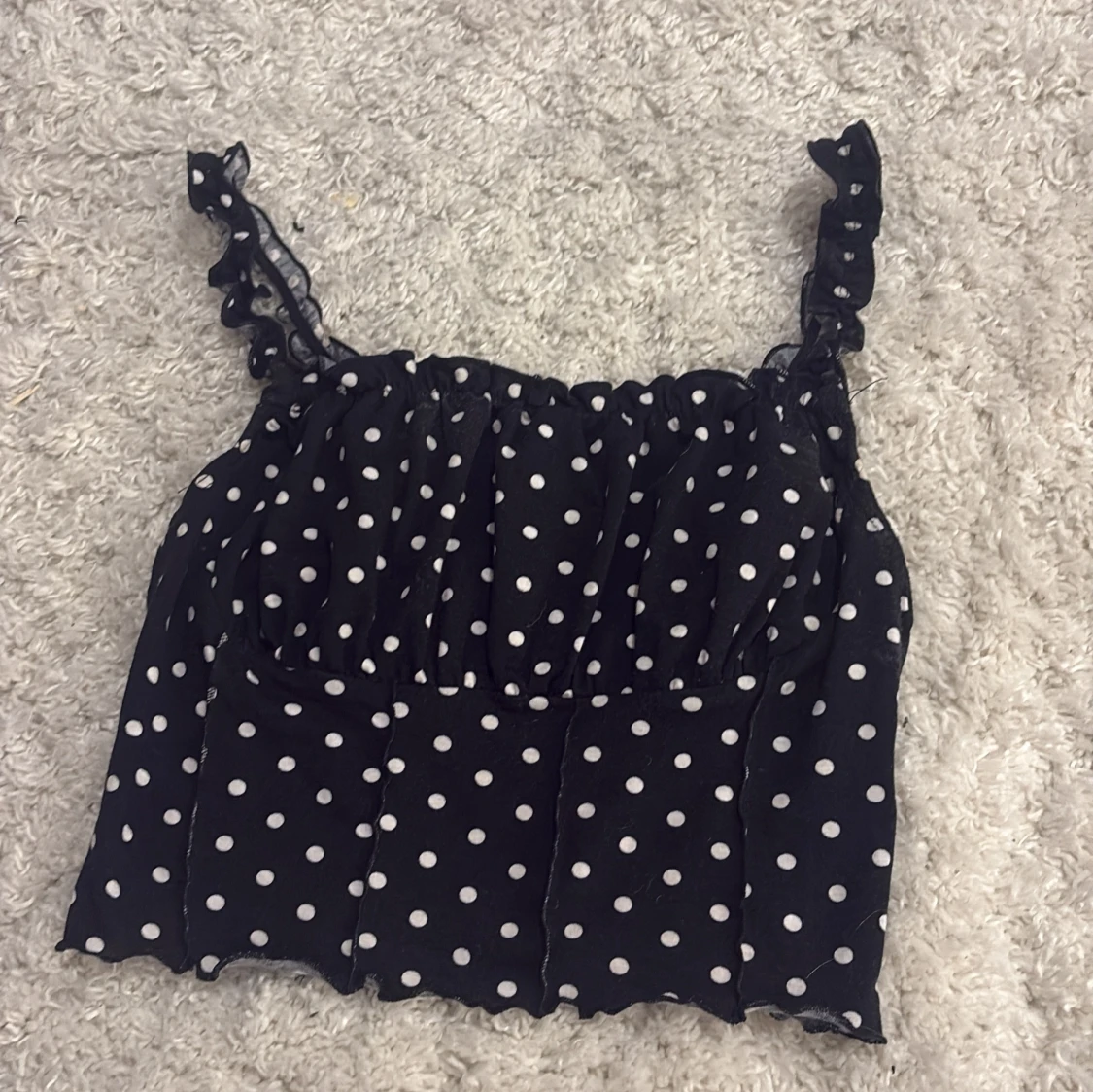 Supersöt svart topp från SHEIN med vita prickar och volangiga axelband. Toppen är ärmlös och har en lätt rynkad effekt upptill. Perfekt för dig som gillar en lekfull och trendig stil.