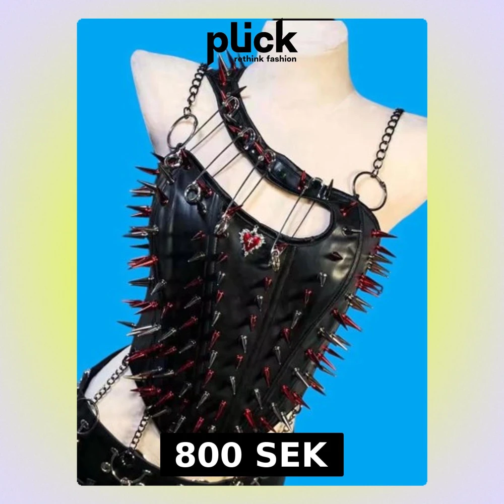 Unik svart korsett i syntetmaterial med en axel, dekorerad med röda och silvriga spikes, stora metallringar och kedjor. Framsidan har detaljer som hjärtberlock och snörning baktill för justerbar passform. Perfekt för dig som gillar edgy och alternativ stil.