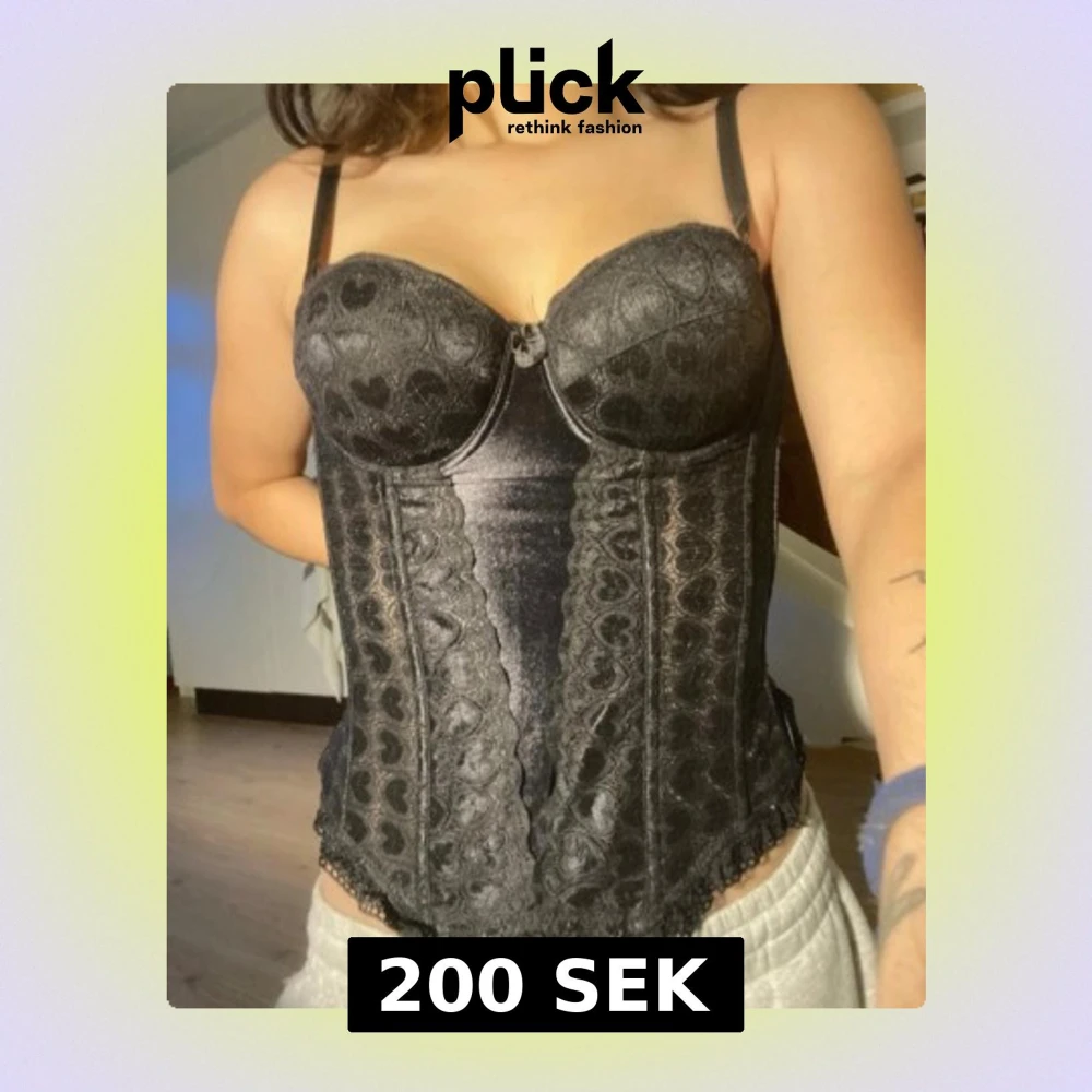 Säljer en svart korsett med vadderade kupor och justerbara axelband. Framsidan har ett snyggt hjärtmönster i spets och sidorna är i glansigt satinmaterial. Nederkanten är dekorerad med spetsdetaljer och baksidan har hakknäppning. Perfekt för att lyfta din outfit.