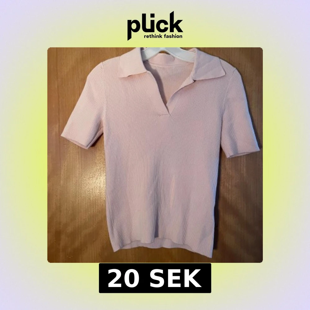 Säljer en ljusrosa ribbad polotopp med korta ärmar och snygg krage. Toppen har en v-ringad öppning framtill och är gjord i ett mjukt, stickat material som känns skönt mot huden. Perfekt för dig som gillar stilrena och enkla plagg med en twist.