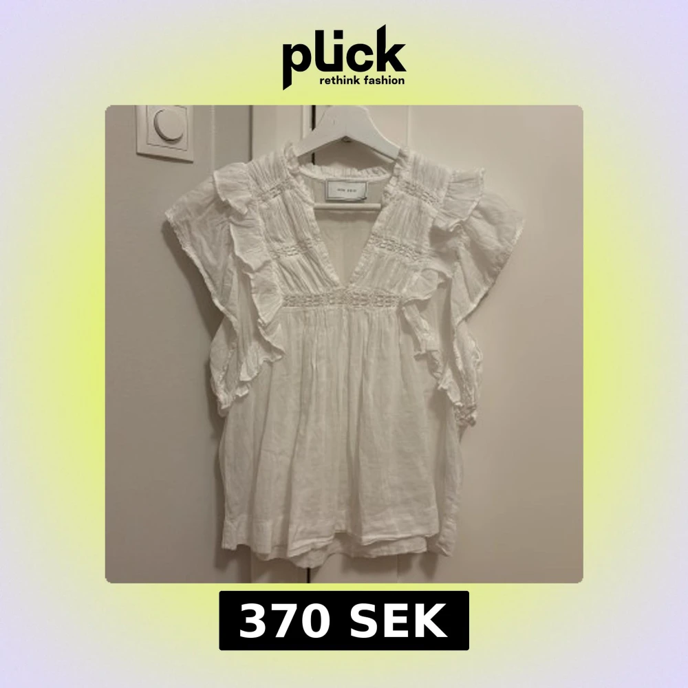 Charmig vit blus från Neo Noir med volangdetaljer och v-ringning. Blusen har korta ärmar och en luftig passform, perfekt för varmare dagar. Blusen är använd fåtal gånger därför i väldigt fint skick!