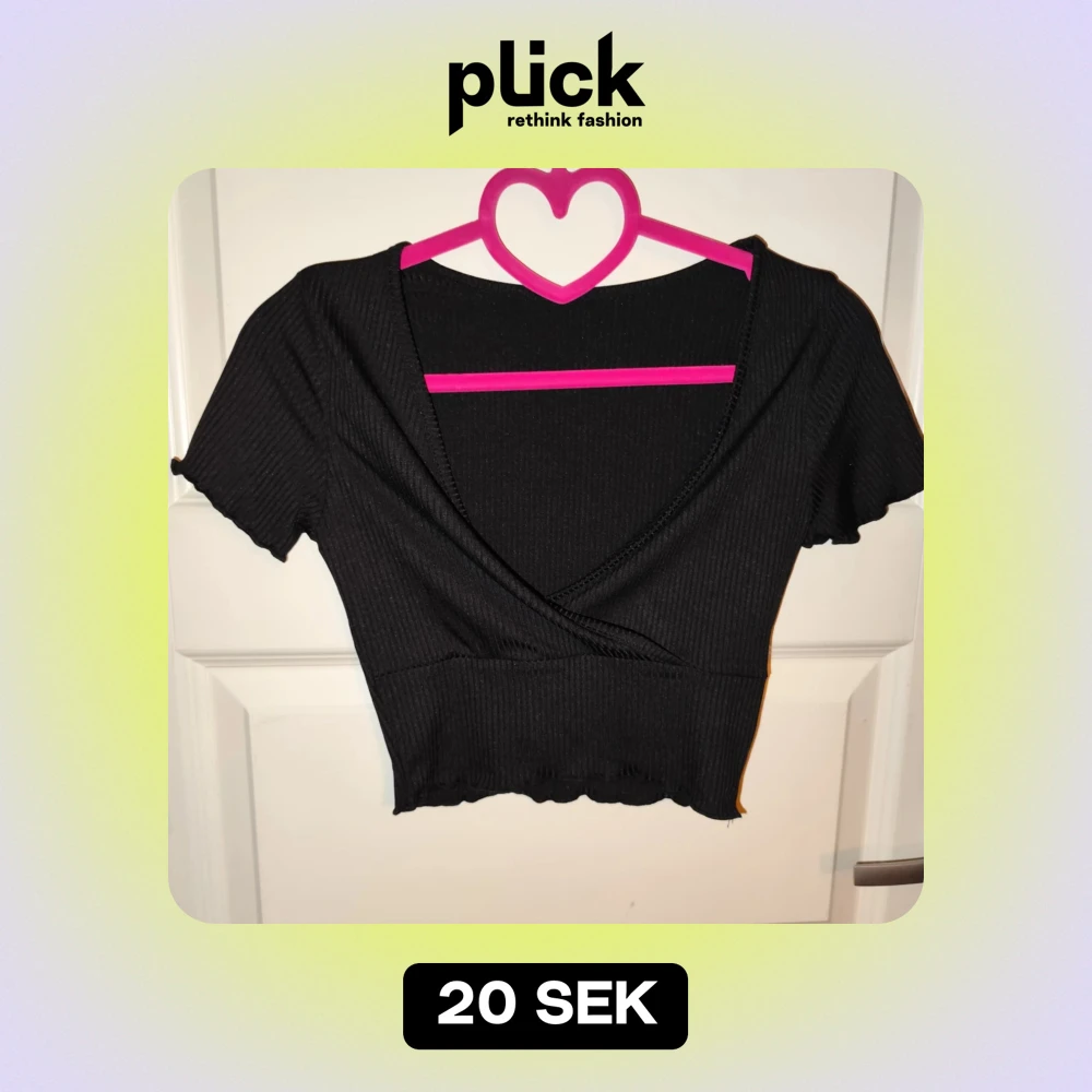 Säljer en snygg svart ribbad omlottopp med korta ärmar. Toppen har en croppad passform och är perfekt för både vardag och fest. Den är i mycket bra skick och passar till många olika outfits.