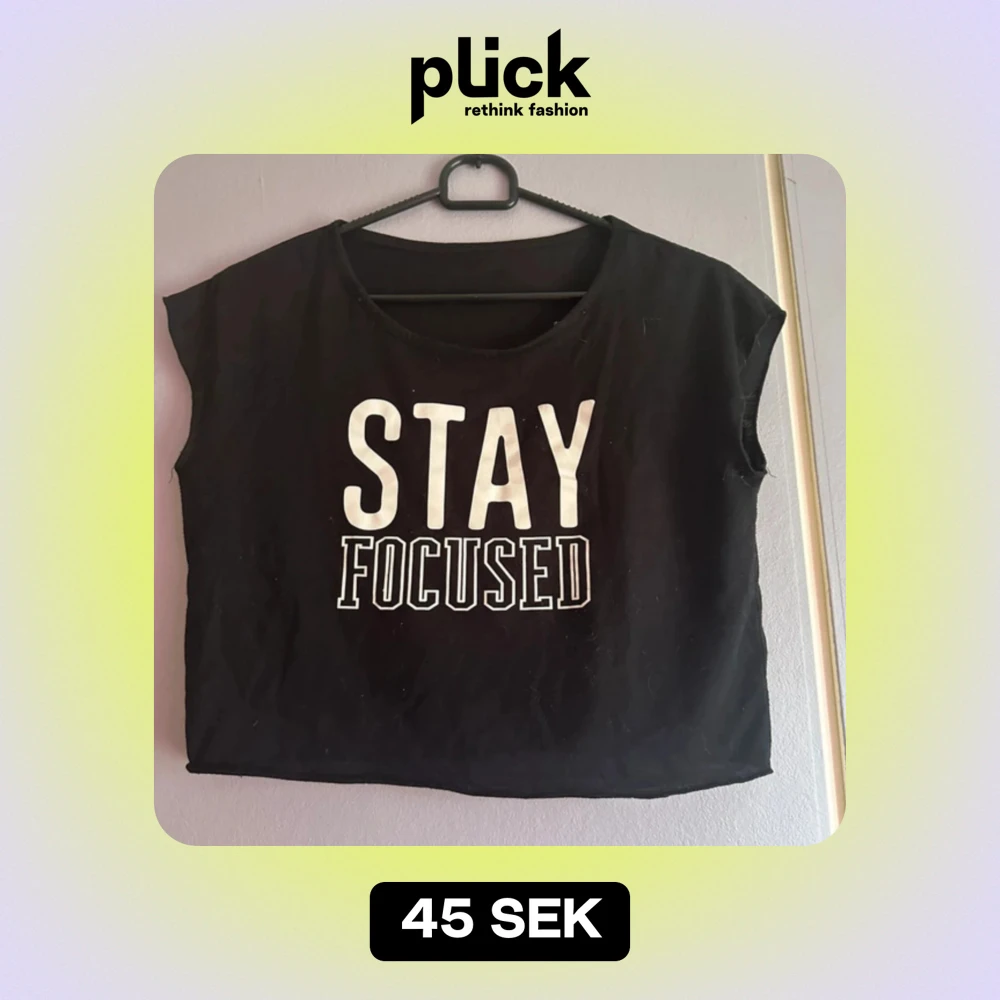 Snygg svart croppad t-shirt med texten 'STAY FOCUSED' i vitt. Perfekt för en avslappnad stil. T-shirten har korta ärmar och en rund halsringning. OBS varan finns på andra sälj sidor också så skynda att fynda innan någon annan gör de!💕