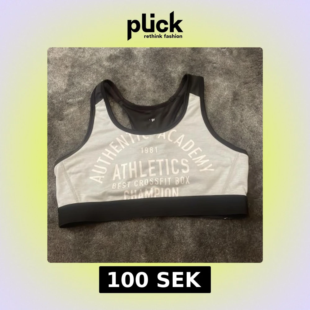 Sport-bh i ljusgrått med svart kant och bred resår. Racerback-modell för extra stöd, perfekt för träning.