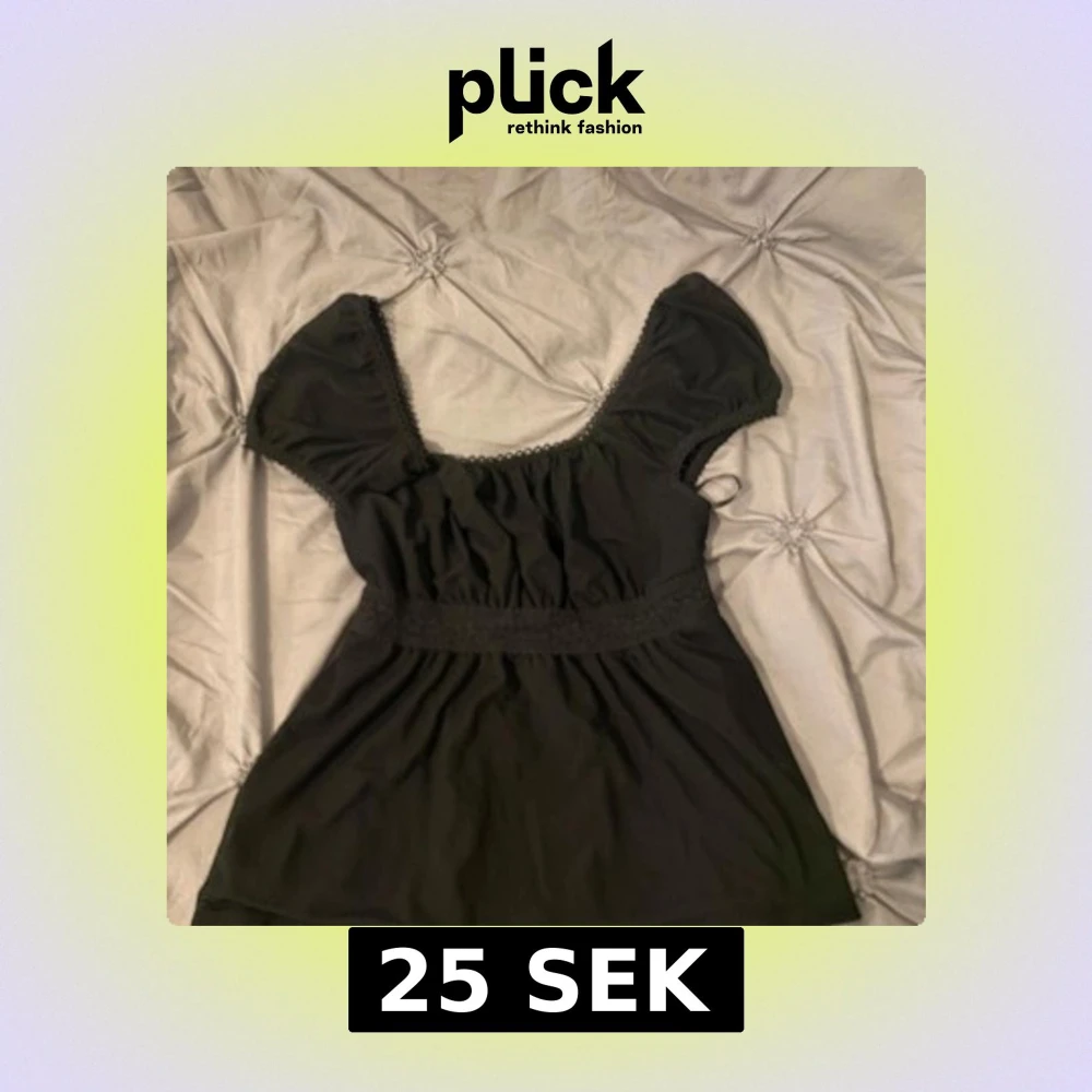 Säljer en svart topp med korta puffärmar och söt spetskant vid halsringningen. Toppen har knytband i midjan och är tillverkad i ett mjukt material. Perfekt för dig som gillar en feminin och enkel stil.