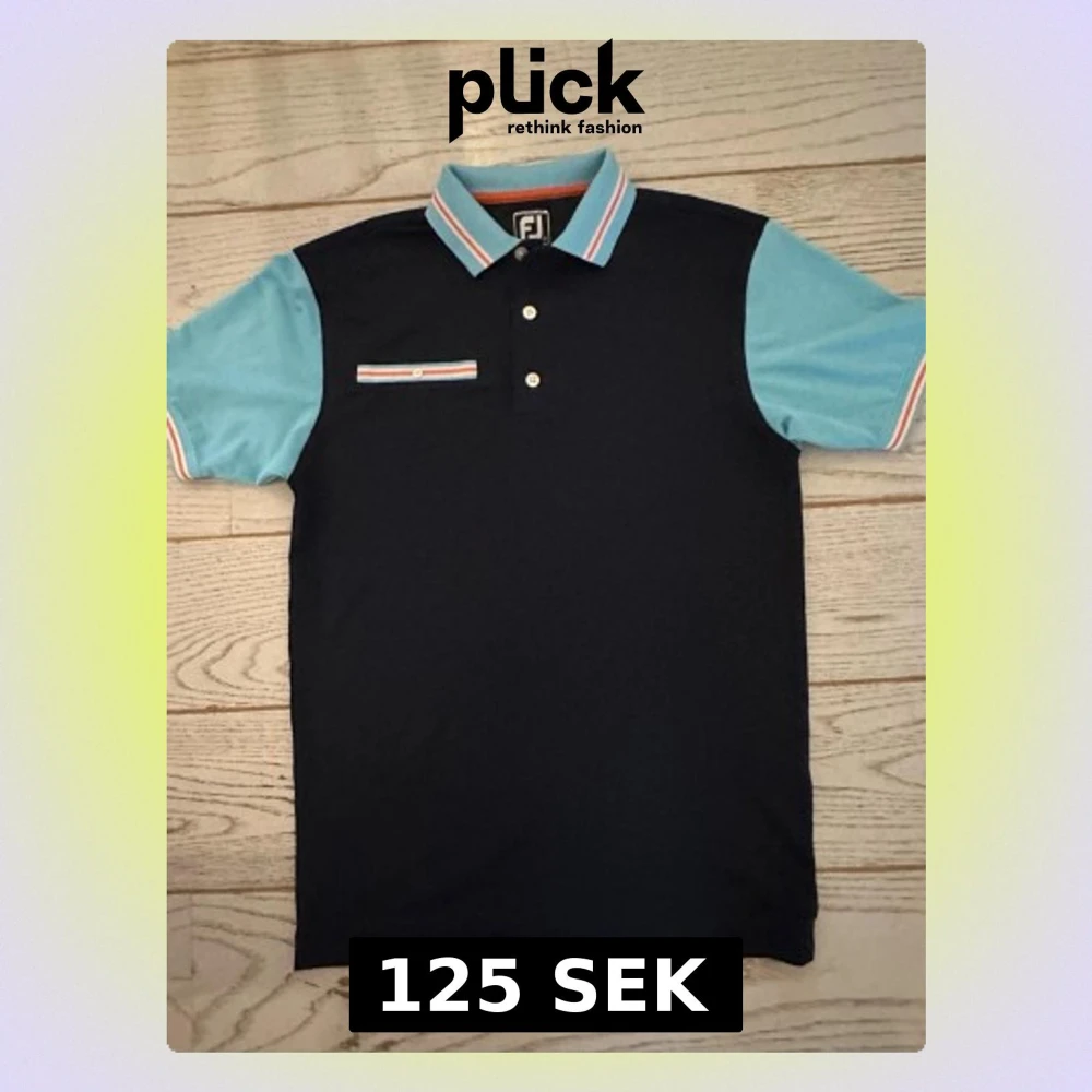 Snygg pikétröja från FootJoy i mörkblått med ljusblå ärmar och krage. Tröjan har vita och röda detaljer på krage, ärmslut och bröstficka. Klassisk pikéknäppning med tre knappar och en liten bröstficka med randig kant.
