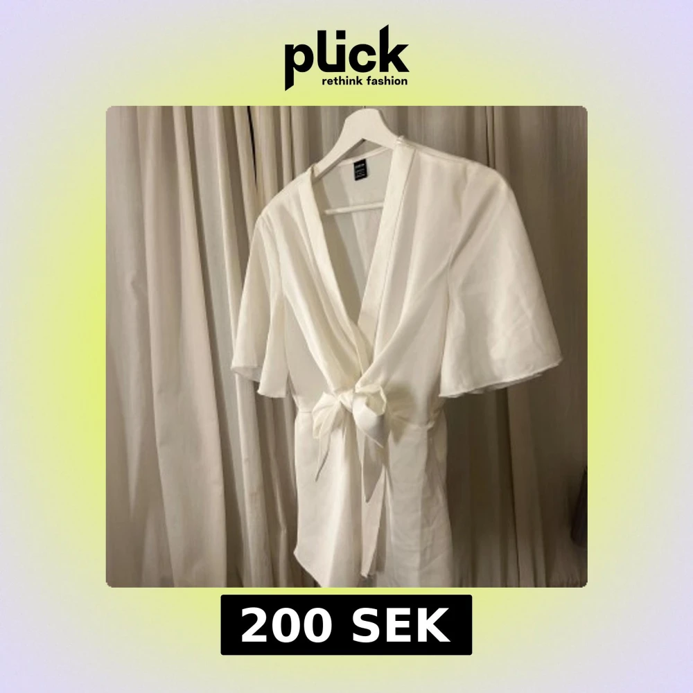 Elegant vit omlotttopp med knyt framtill och korta ärmar. Använd 1 gång, kommer inte till användning.