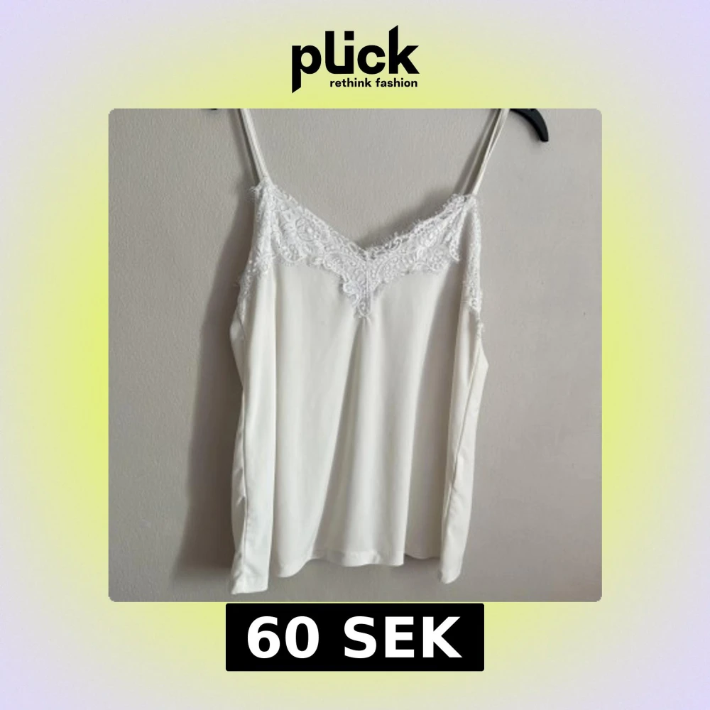 Säljer ett elegant vitt linne med tunna axelband och vacker spetsdetalj vid halsringningen. Perfekt för en stilren och feminin look. Passar bra till både jeans och kjol.