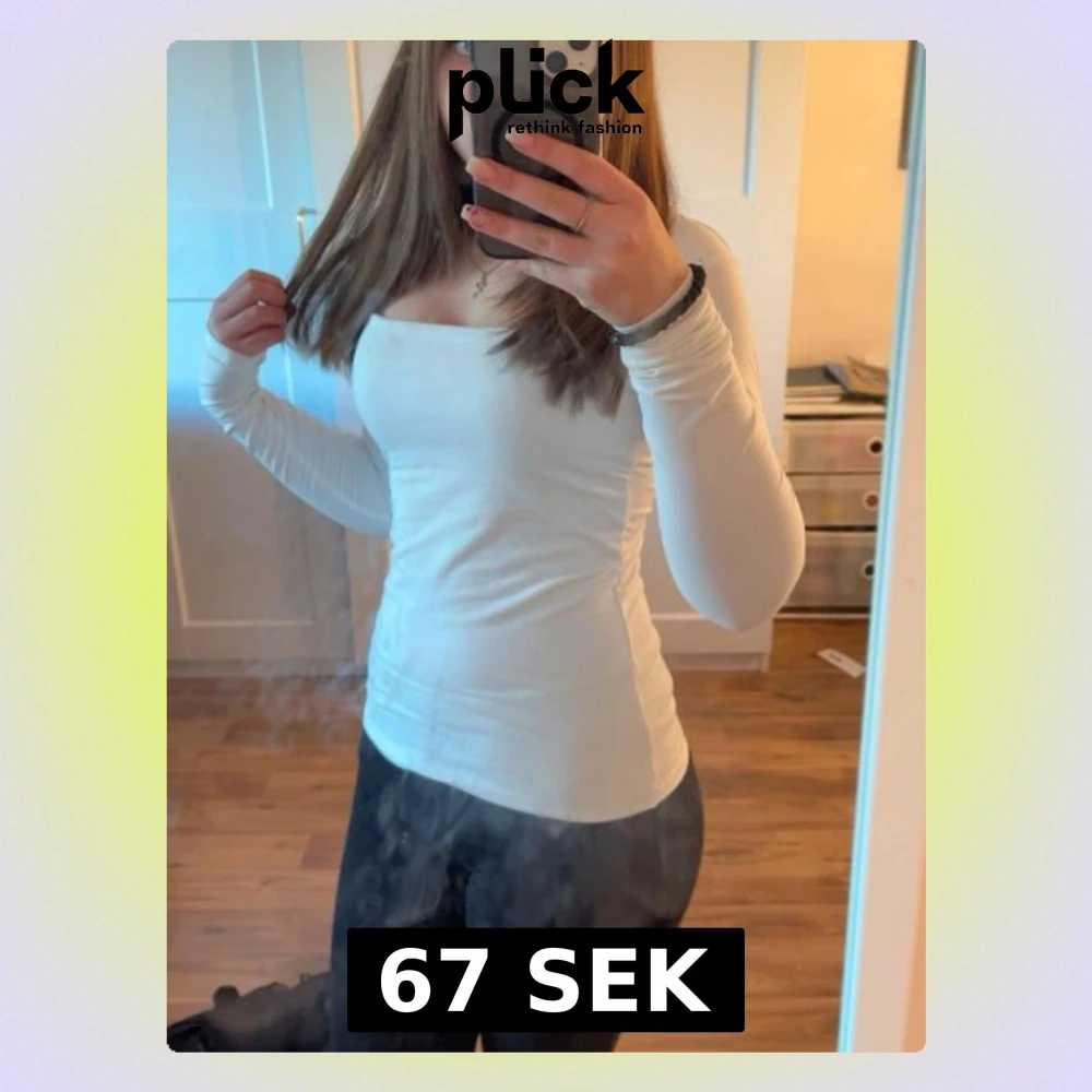 Säljer en vit långärmad topp med snygg fyrkantig halsringning. Modellen är slim och sitter tight mot kroppen, perfekt att styla med jeans eller kjol. Materialet känns mjukt och stretchigt, troligen bomull eller polyester. Passar dig som gillar minimalistisk och clean stil.