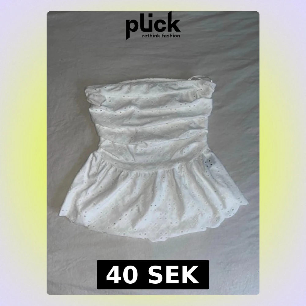 Säljer en vit bandeau tubtopp med broderade hålmönster och volang nedtill. Toppen är axelbandslös och har en söt, feminin look med scallop-kant. Perfekt för varma dagar och sommarhäng.