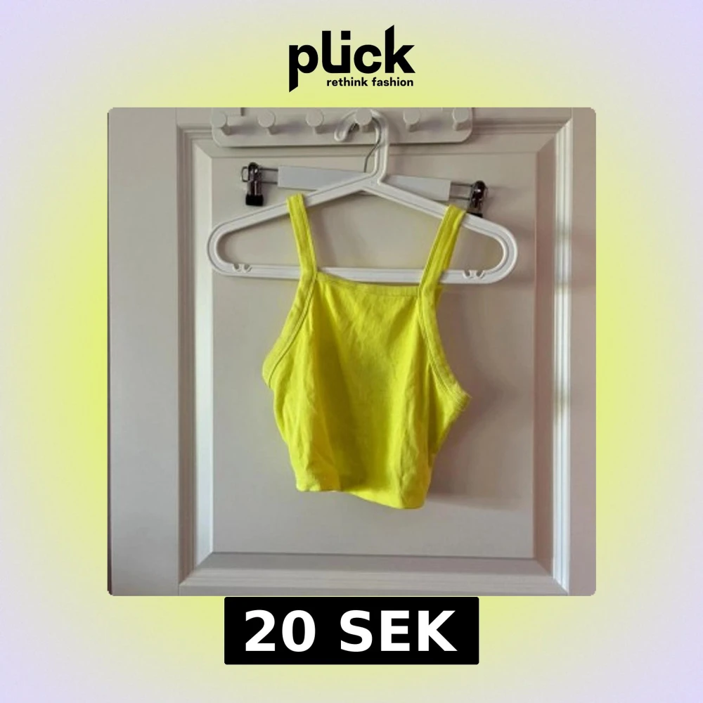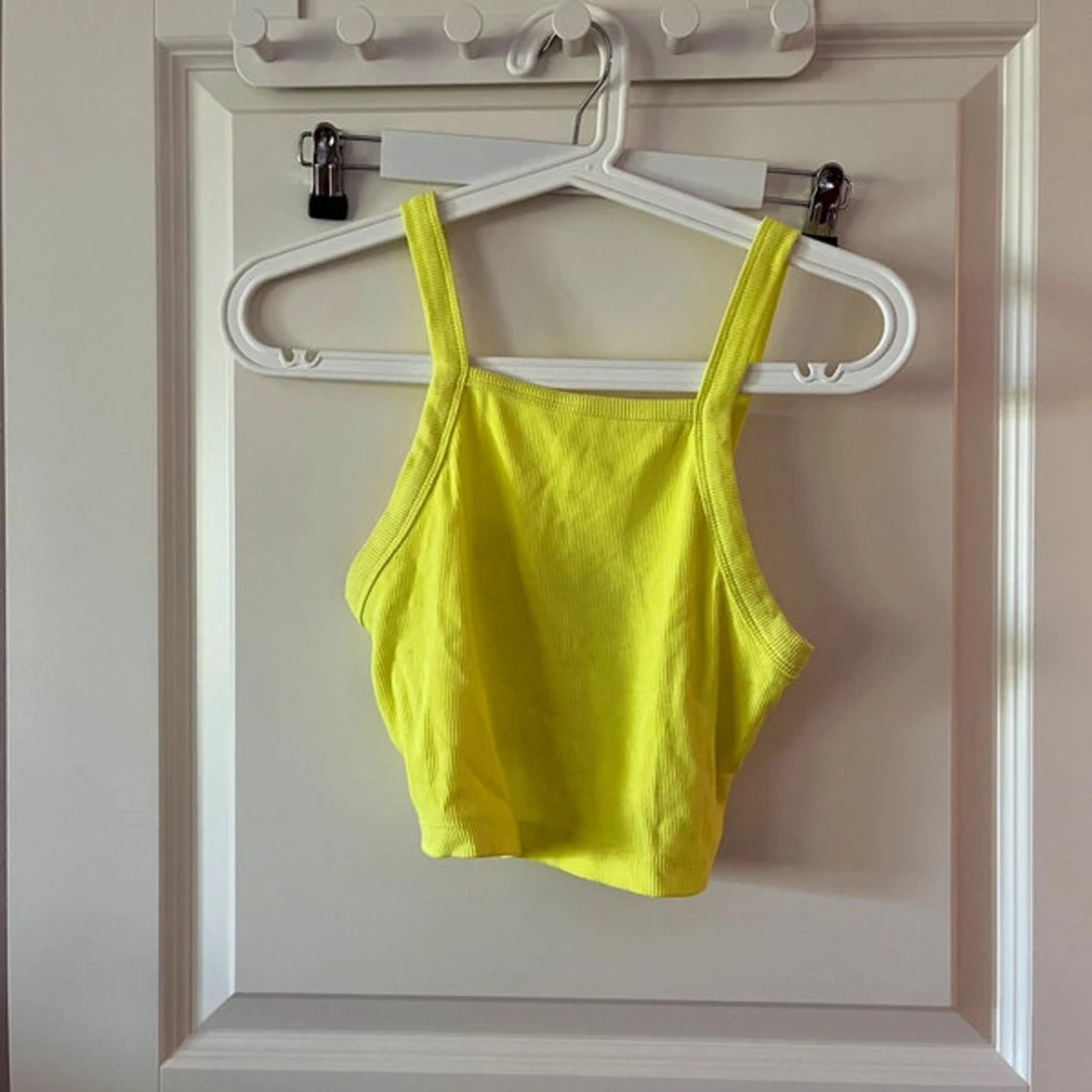 Snygg croppad linnetopp i en riktigt poppig gul färg. Toppen har breda axelband och är tillverkad i ett mjukt, ribbat bomullstyg som sitter skönt mot kroppen. Perfekt för varma dagar när du vill sticka ut lite extra.