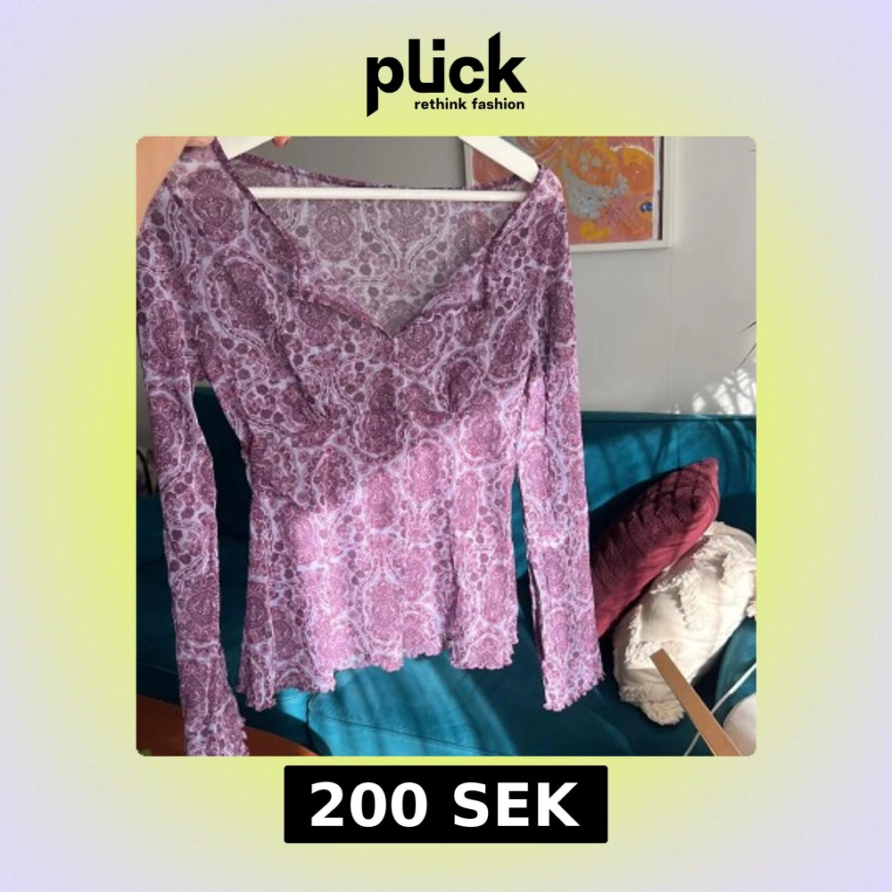 Säljer en snygg lila topp med ett detaljerat mönster. Toppen har långa ärmar som blir vidare nedtill, och en v-ringad design som ger en elegant touch. Perfekt för att piffa upp garderoben! Den är åt det genomskinliga hållet och har en snygg söm som markerar bysten mellan xs-m beror på hur man vill att den sitter