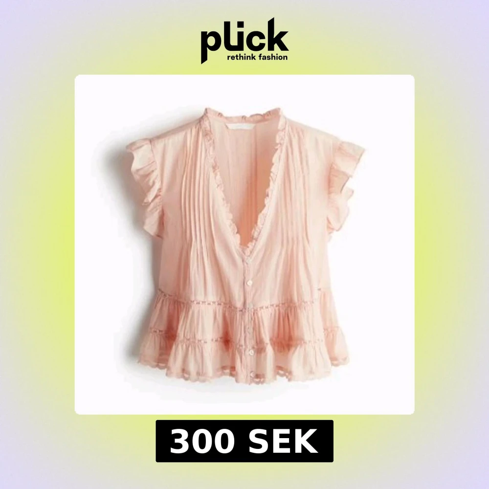 Supersöt ljusrosa blus med volangdetaljer och knappar framtill. Blusen har v-ringning, korta volangärmar och är tillverkad i ett lätt, luftigt material. Perfekt för en romantisk och feminin stil.