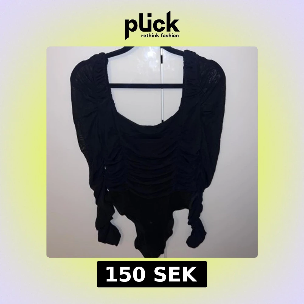 Snygg svart långärmad body med rynkade detaljer och djup urringning. Perfekt för en stilren look. För fler bilder hör av er.