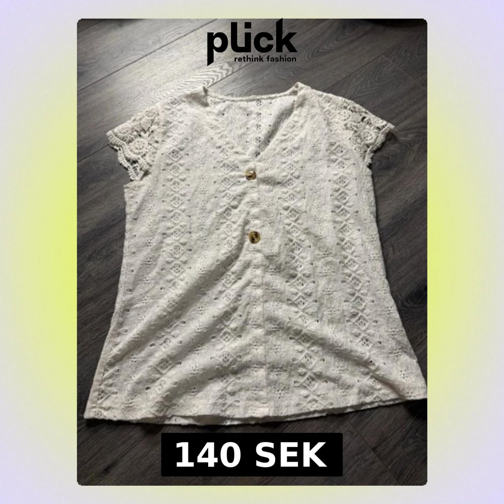 Säljer en söt vit blus med v-ringning och två dekorativa knappar framtill. Blusen har korta, spetsiga ärmar och ett broderat spetsmönster över hela plagget. Perfekt för sommarens alla tillfällen och ger en romantisk vibe.