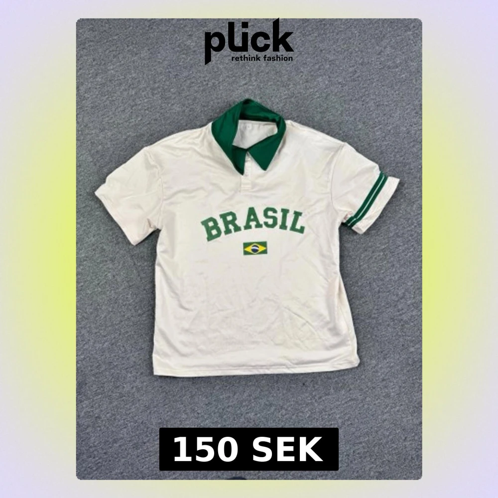 Vit t-shirt med grön krage och gröna detaljer på ena ärmen. På bröstet står det 'BRASIL' och en liten brasiliansk flagga är tryckt under texten. Perfekt för dig som gillar sportig stil och vill visa ditt stöd för Brasilien.