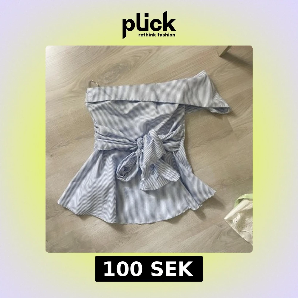 Superfin blåvit randig offshoulder topp med bred volang upptill och stor knytning i midjan. Toppen har en figurnära passform upptill och faller ut nertill för en snygg siluett. Perfekt till jeans eller kjol för en trendig look.