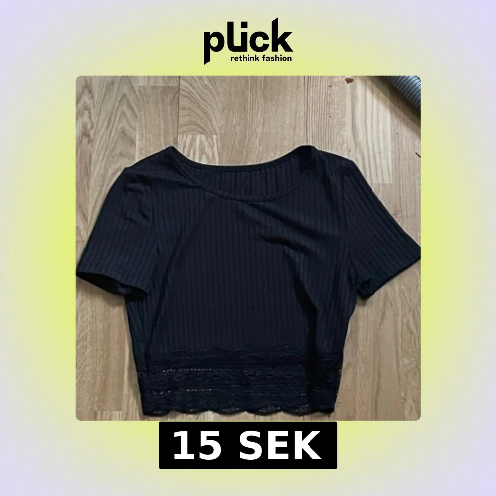 Svart croppad topp med ribbad struktur och korta ärmar. Toppen har en rund halsringning och en snygg spetskant längst ner som ger en extra detalj. Perfekt för att lyfta vilken outfit som helst.