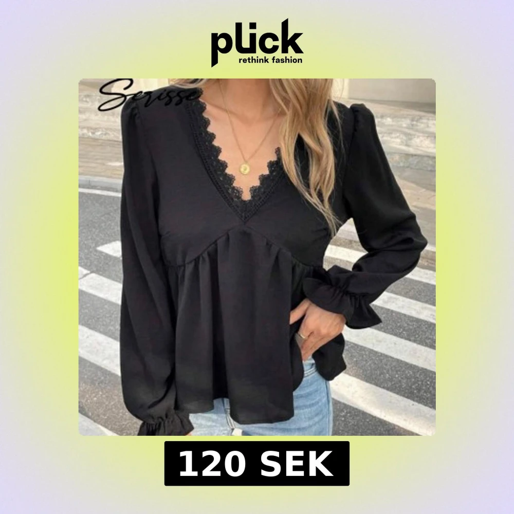 Supersnygg svart blus från Serisse med v-ringning och spetsdetaljer längs halsen. Blusen har långa ärmar med volang vid ärmslut och en lös, flowy passform som ger en chill men ändå stilren vibe. Perfekt att matcha med jeans för en trendig look. Aldrig använd