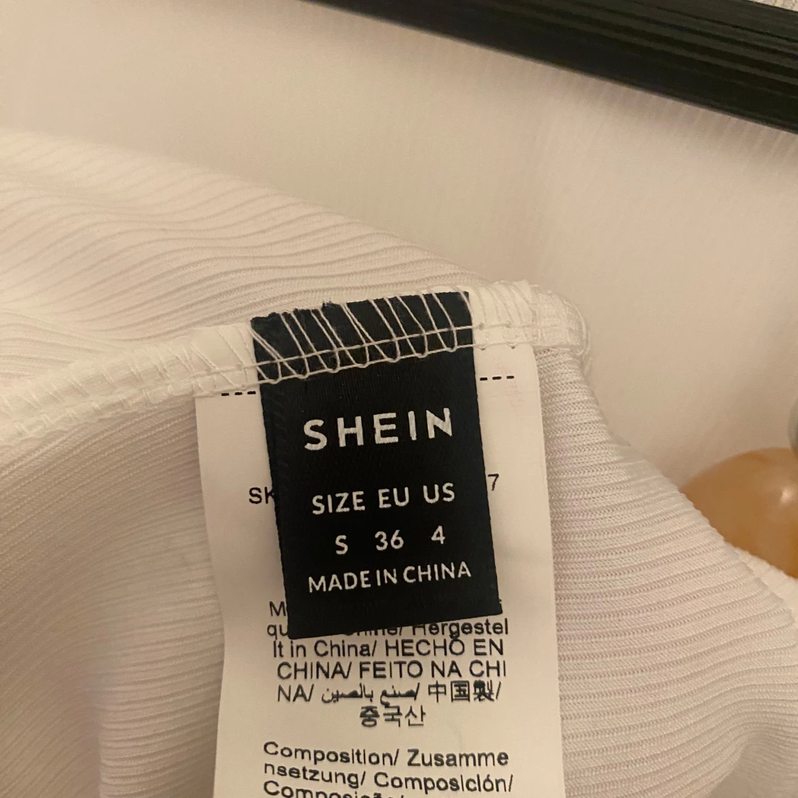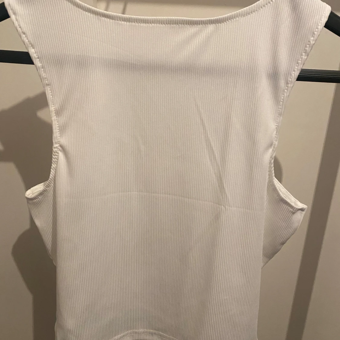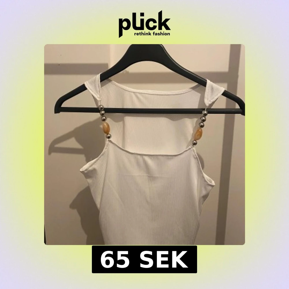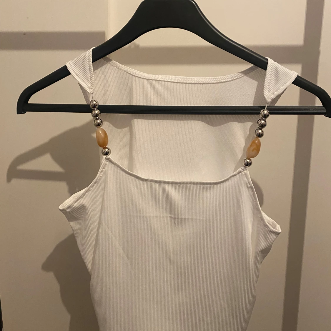 Supersnygg vit ribbad linnetopp från SHEIN i storlek S. Toppen har smala axelband med coola pärldetaljer i silver och beige, vilket ger en unik touch. Perfekt att styla med jeans eller kjol för en trendig look. Aldrig använd.