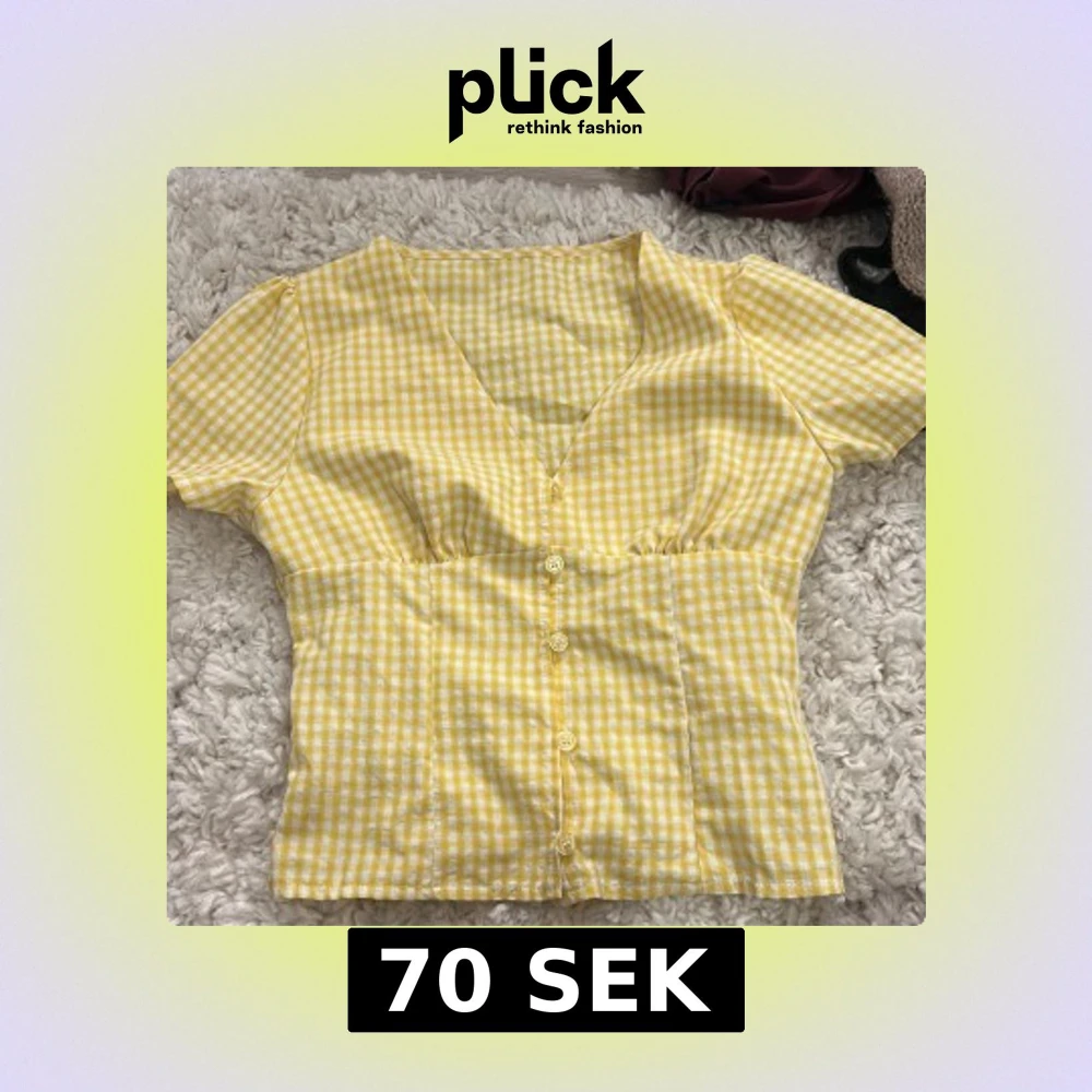Superfin gul och vit rutig blus med v-ringning och korta ärmar. Blusen har knappar framtill och är figursydd för en snygg passform. Tillverkad i mjuk polyester med lite stretch för extra komfort. Perfekt för dig som gillar färg och mönster! Köpt secondhand
