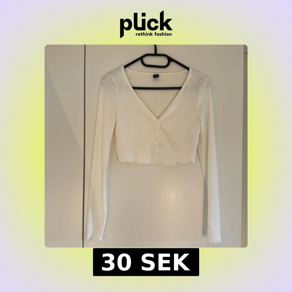Säljer en vit croppad topp från SHEIN i ribbat material. Toppen har lång ärm, v-ringning och knappar framtill. Perfekt att styla med höga jeans eller kjol för en clean look. Aldrig använd