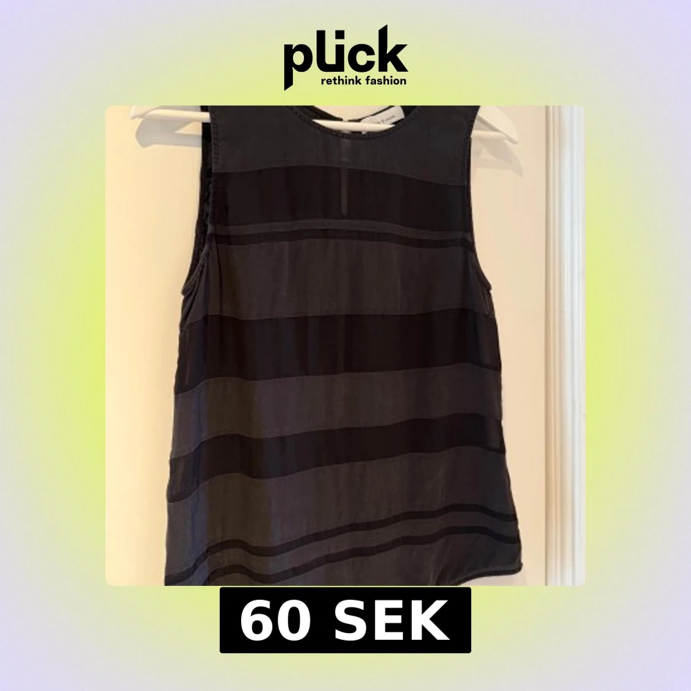 Snygg svart ärmlös topp från Samsøe & Samsøe med breda horisontella ränder. Perfekt för en stilren look. Tillverkad i ett mjukt material som ger en bekväm passform. Jag är osäker på storleken men skulle säga att den passar både S och M. Jag brukar kunna ha både S och M i toppar. Den här sitter något tight över brösten men ändå okej ☺️