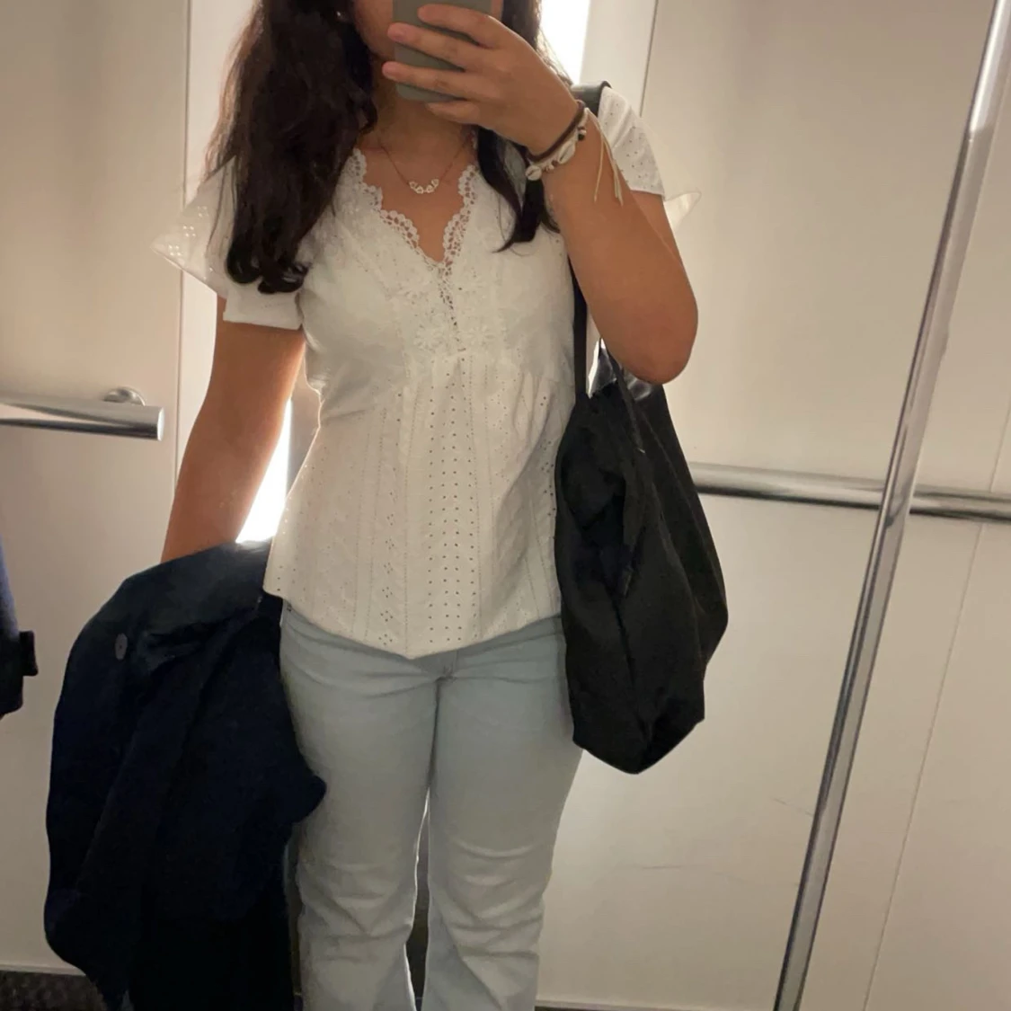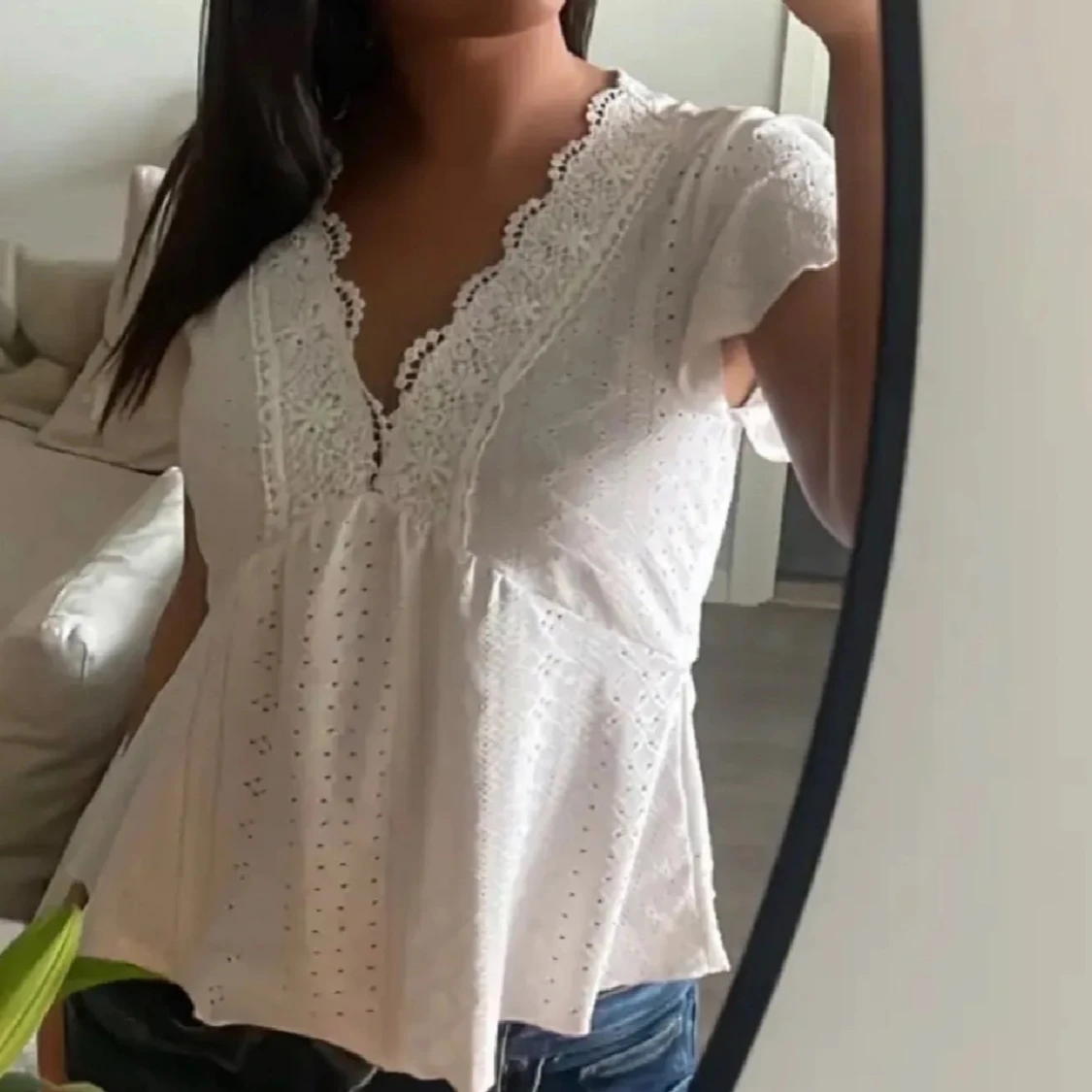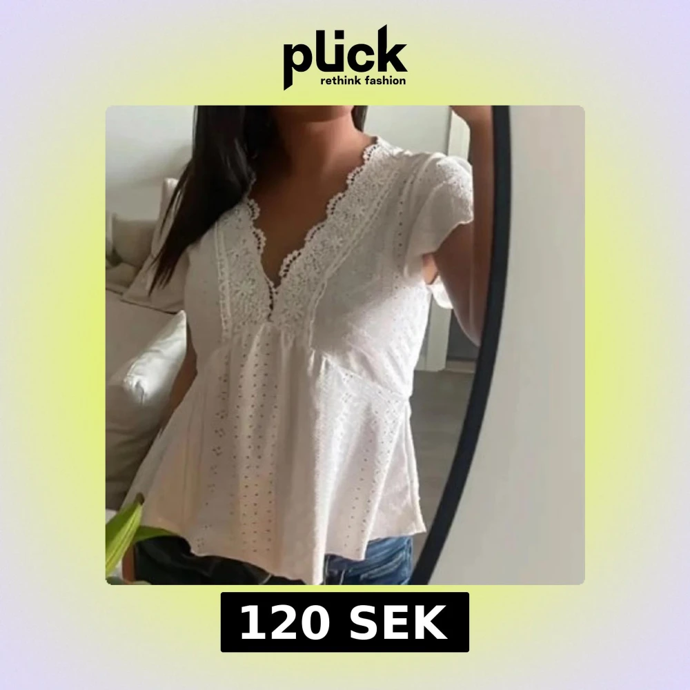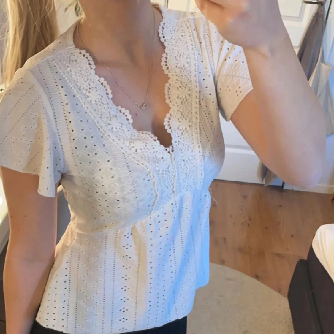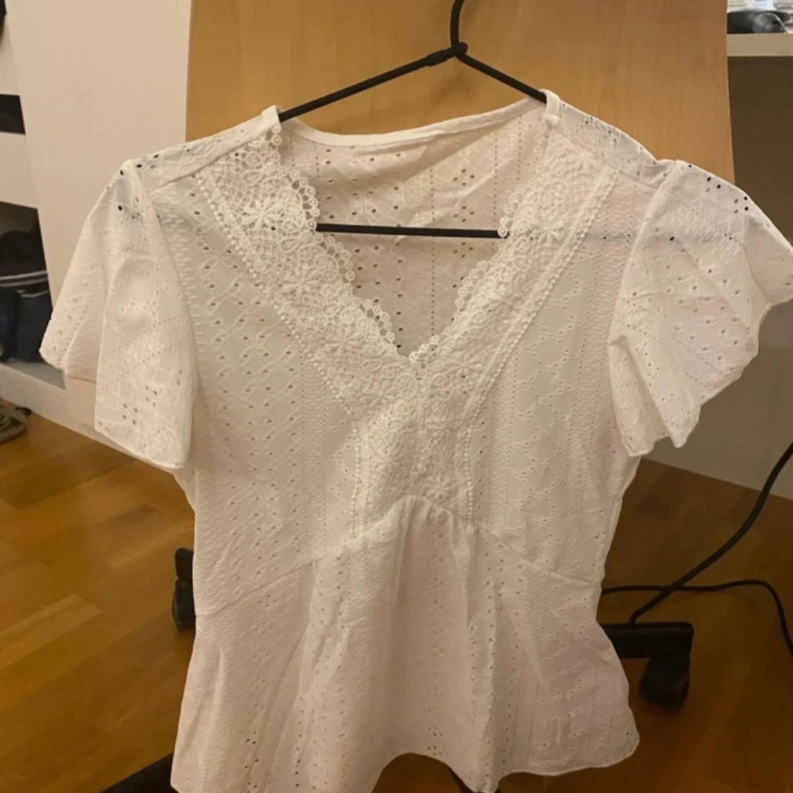 Supersöt vit blus i bomull med broderade detaljer och spets längs v-ringningen. Blusen har korta ärmar, lätt utsvängd passform och små hålmönster över hela tyget. Perfekt för en fräsch och somrig look!
