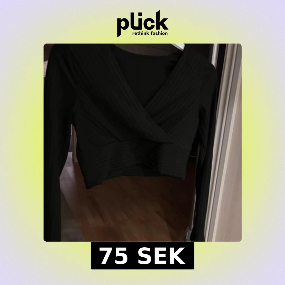 Säljer en svart långärmad omlottopp med ribbade ränder. Toppen har en croppad passform och djup v-ringning framtill.