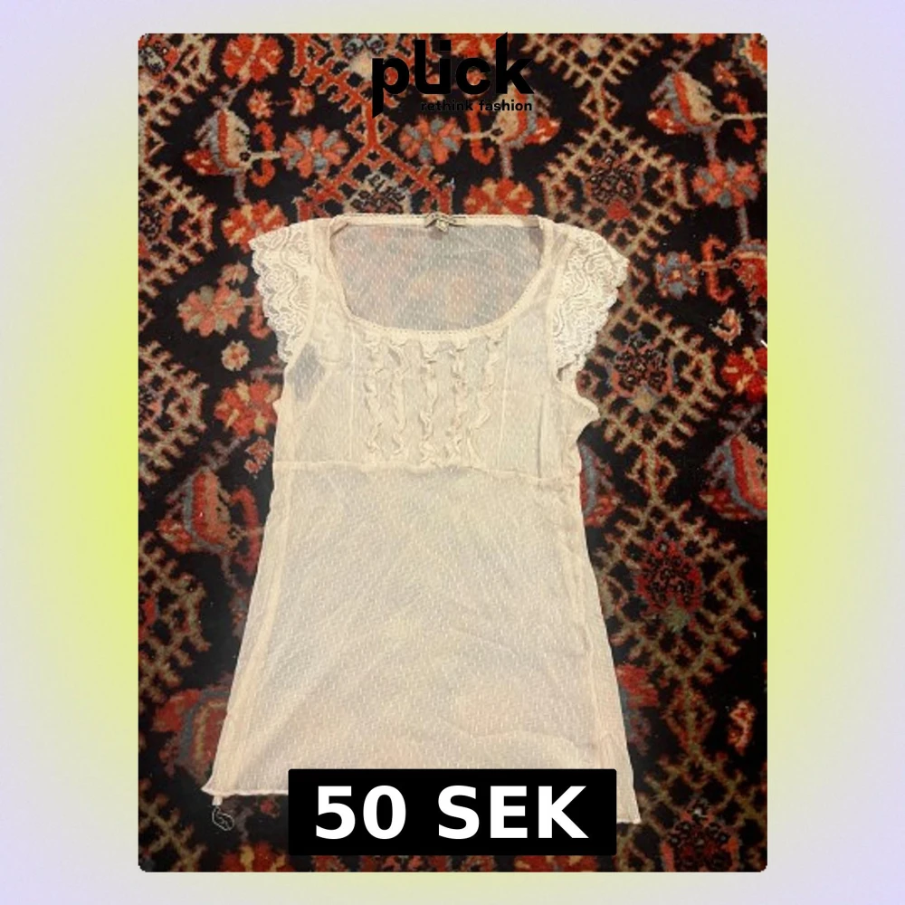 Säljer en söt vit blus från KRLINDE med spetsdetaljer på ärmarna och volanger framtill. Blusen har en rundad hals och är tillverkad i ett lätt, transparent material med diskret struktur. Perfekt för dig som gillar romantisk och feminin stil.