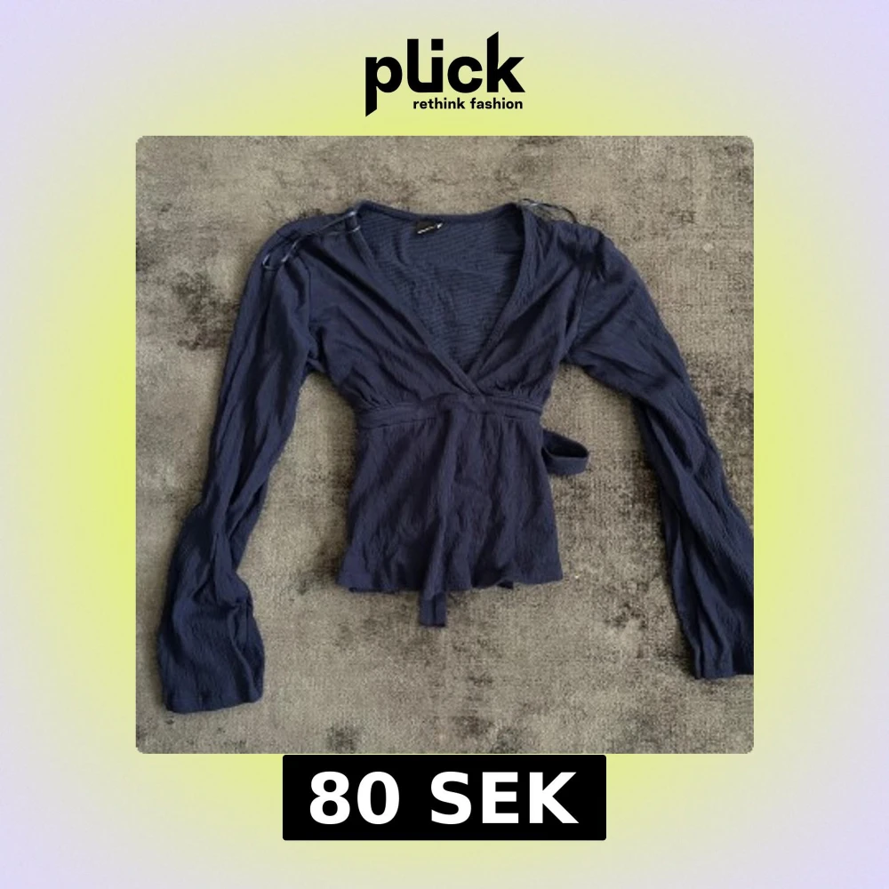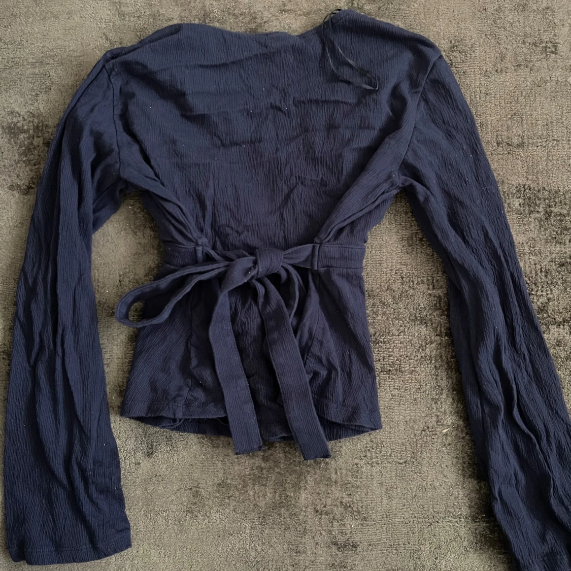 Säljer en mörkblå omlottopp med långa ärmar och knytband i midjan. Toppen har v-ringning och är tillverkad i ett lätt, strukturerat tyg. Perfekt för dig som gillar en feminin och trendig stil.