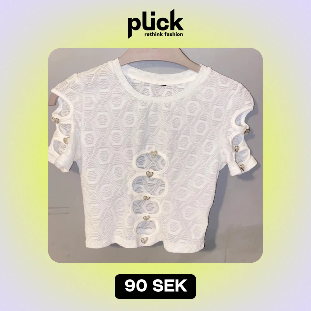 Säljer en superfin vit topp med korta ärmar och unikt mönster. Toppen har dekorativa hjärtformade knappar längs ärmarna och framsidan, vilket ger en söt touch. Perfekt för sommardagar eller en festlig kväll!