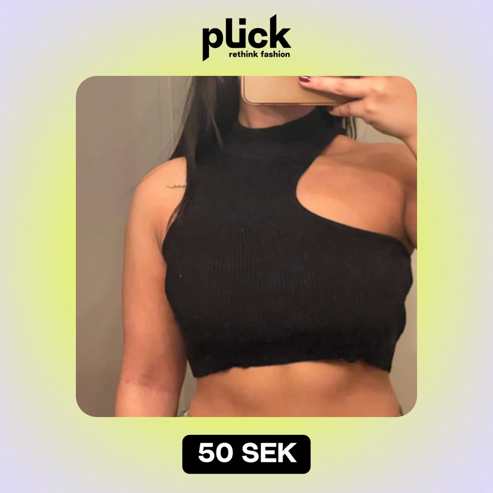 Snygg svart ribbad topp som är croppad och ärmlös. Perfekt för en utekväll eller sommarens varma dagar. Den har en hög hals och en stilren design som gör den lätt att matcha med olika outfits.