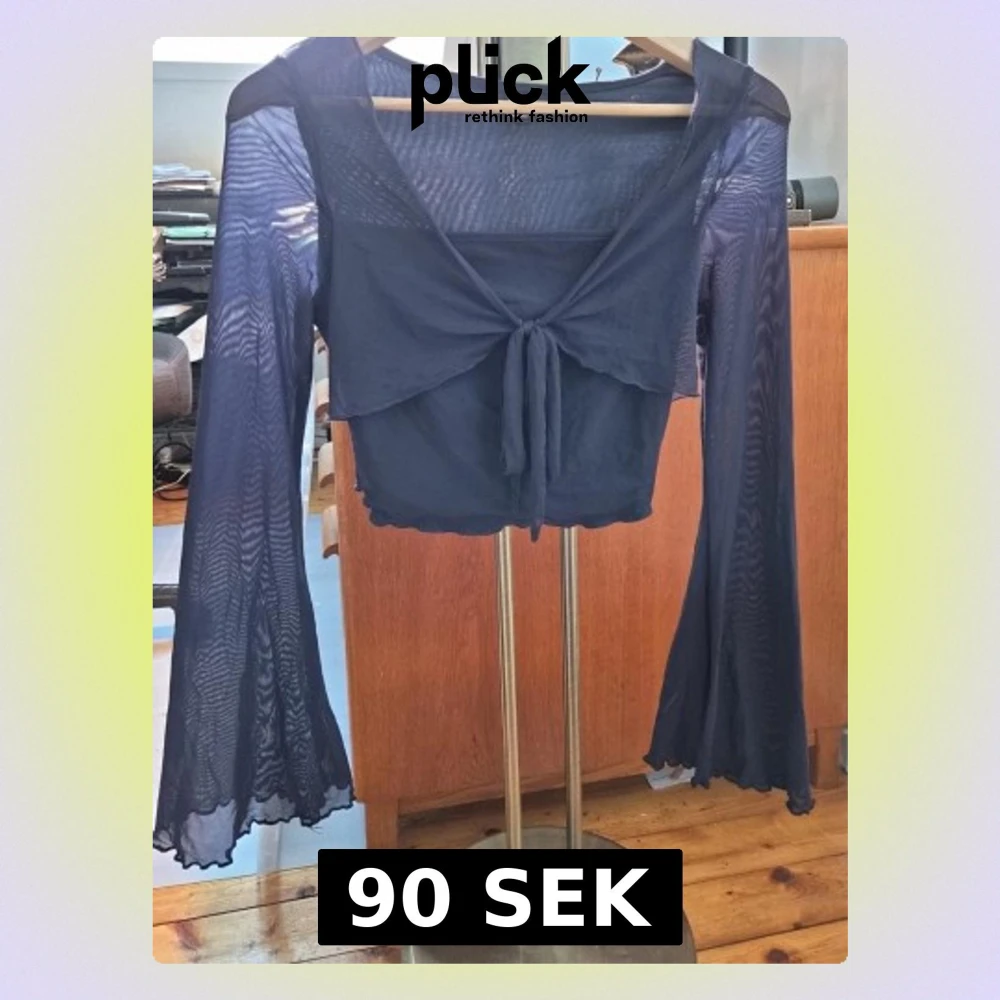 Säljer en mörkblå bolerotopp i mesh med långa, utsvängda ärmar och knyt framtill. Toppen är croppad och har en lätt transparent look som ger en cool vibe. Perfekt att styla över ett linne eller klänning för extra edge.