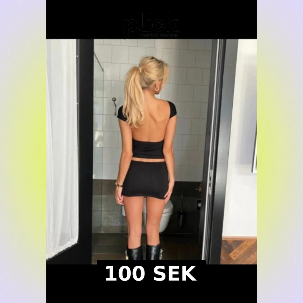 Säljer en svart, tight och croppad topp med korta ärmar och helt öppen rygg. Toppen har en enkel och stilren design i stretchigt material som sitter snyggt på kroppen. Perfekt för dig som gillar minimalistisk och trendig stil.