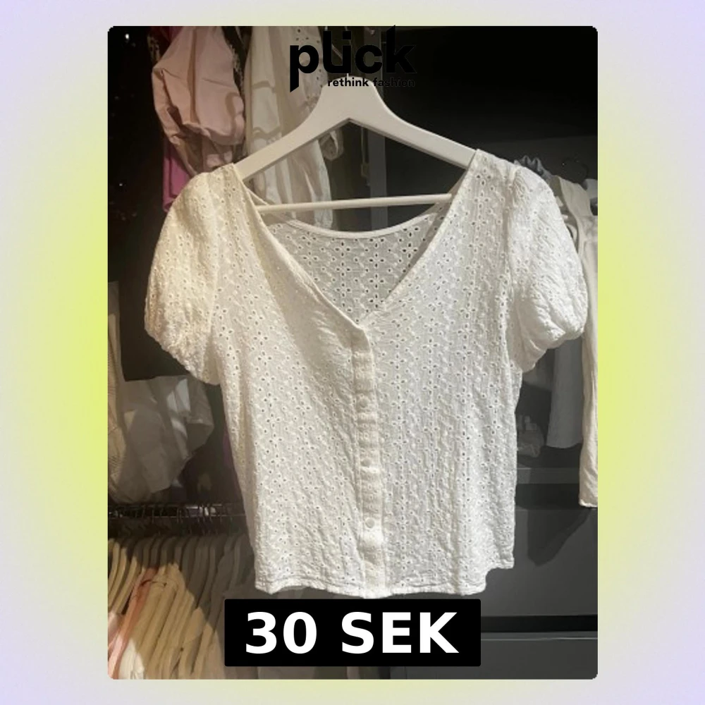 Söt vit blus med korta puffärmar och v-ringning. Blusen har broderade hålmönster och knappar framtill. Perfekt till jeans eller kjol för en fräsch look. Materialet känns lätt och luftigt.