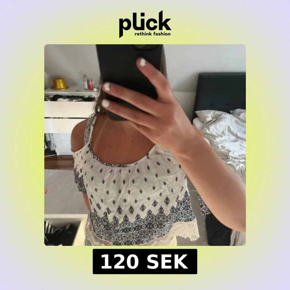 Säljer en söt croppad blus i vitt med blått mönster och tunna axelband. Blusen har fina spetsdetaljer och volang längst ner, perfekt för varma dagar.