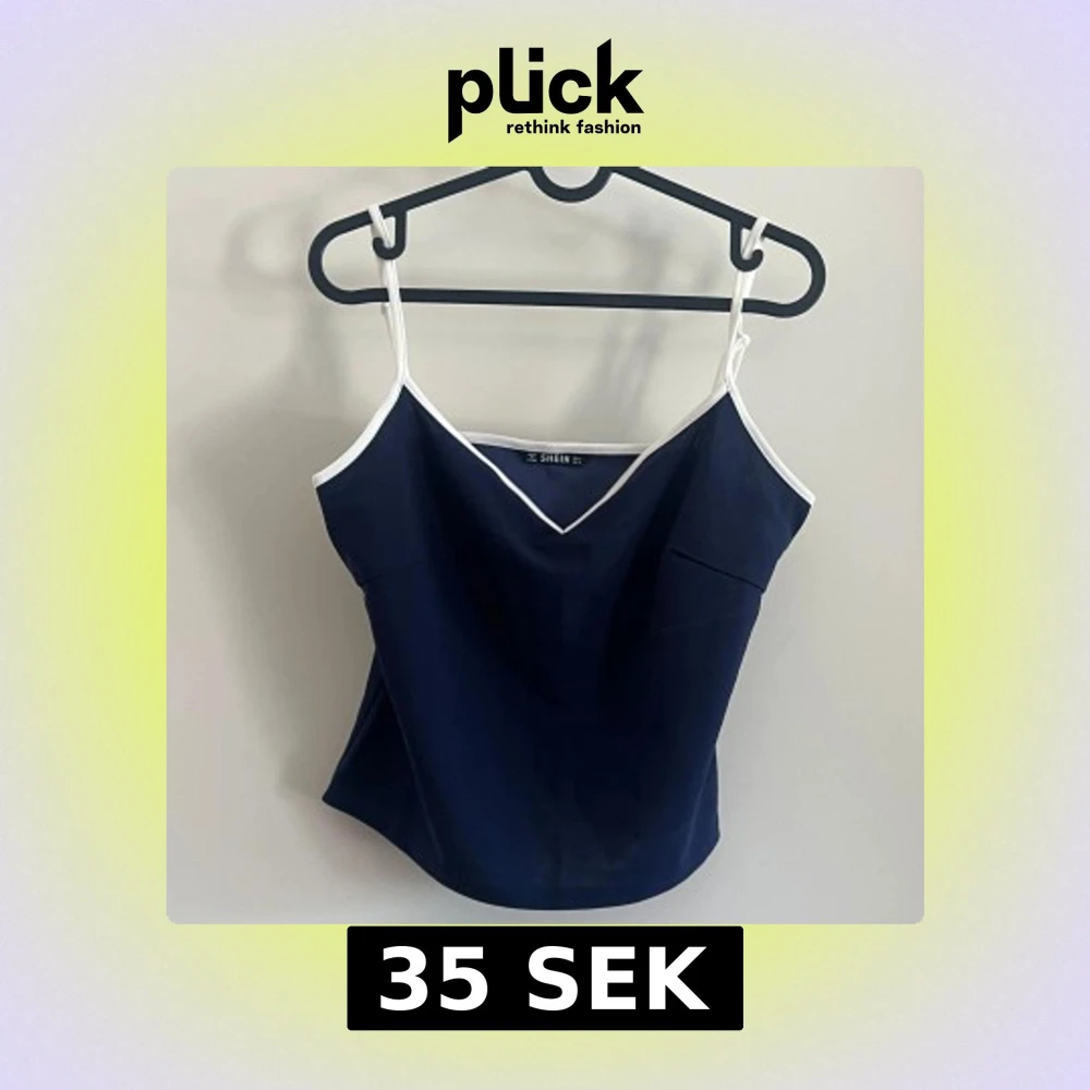 Marinblå linnetopp med tunna vita axelband och vit kant längs urringningen.